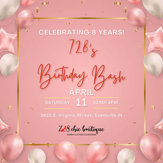 Hi, I'm Michelle! I personally want to welcome you to 728! Here's a little bit about me and what 728 means to me. I started 728 in 2018 out of my home; my home address number was "728" at the time. The home had previously belonged to my grandparents who were also entrepreneurs! My mom was also an entrepreneur, so having close family members who built their own brands, they inspired me to build my own too. 728 is a women's clothing and accessory boutique located in Southern Indiana! I have always loved helping others and with a healthcare and marketing background, I eventually landed in the entrepreneurial world. And here I am, inspiring and changing lives with women just like you! Fun facts about me: I am a mom, dog mom, wife and I am one who loves sweet tea and Jesus! I have loved fashion since I was a little girI. I love to travel, obsessed with coffee, I'm an antique junkie and love being outdoors!