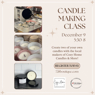 Learn moreJoin us for a fun and creative experience as you design and pour your own custom candles! In this hands-on workshop, you’ll create two 6 oz candles using premium soy wax and beautiful fragrance oils! Cozy Home Candle Co will guide you step-by-step—from choosing your scents to pouring your candles!