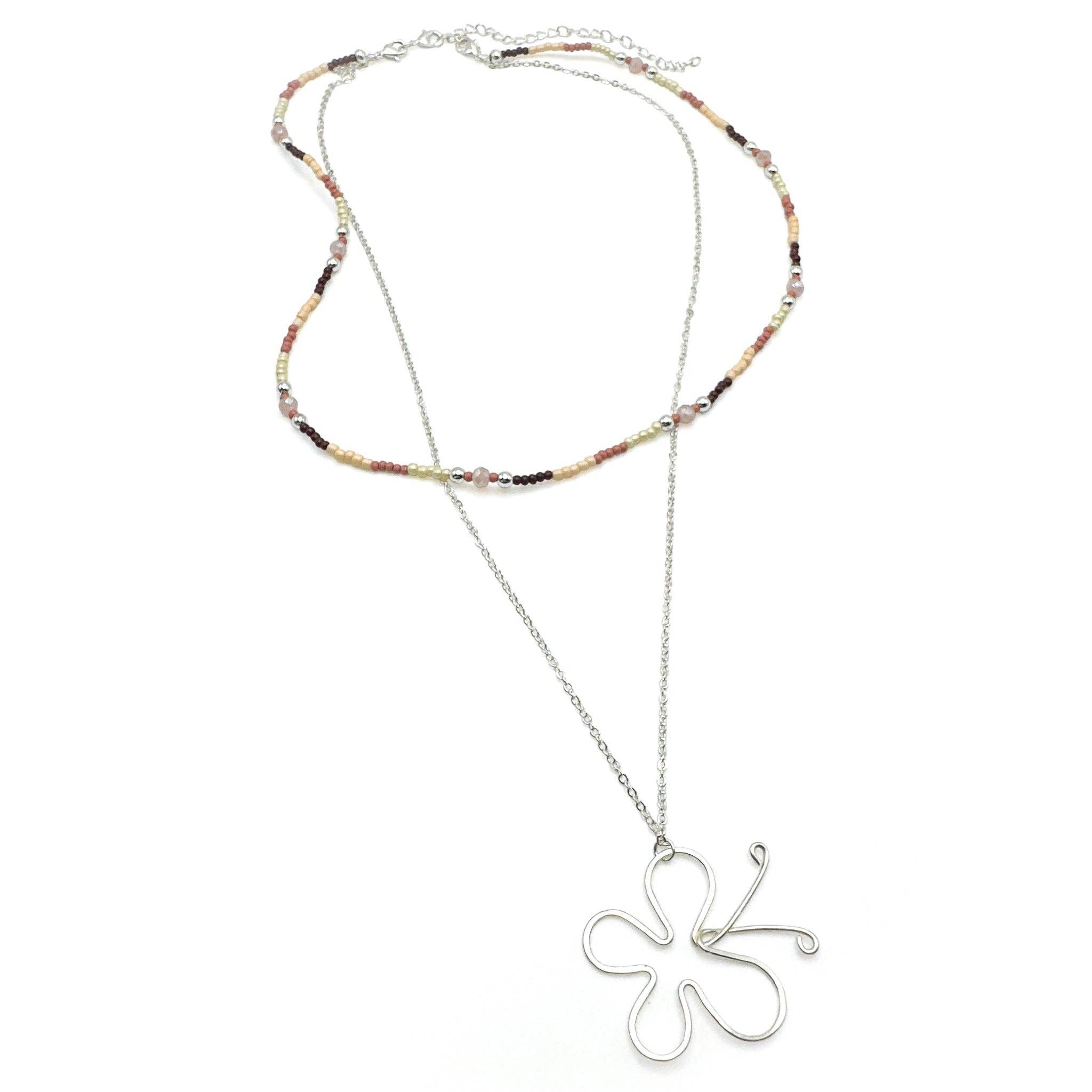 A 21 inch silver chain holds a hammered silver wire butterfly pendant 1 5/8 inches across. The second piece is a 17 inch beaded choker of chocolate brown, peach and cream seed beads, peach crystals and silver beads. The beaded necklace is removable with lobster clasps on each end. The silver chain is extendable to 24 inches with its lobster clasp and 3 inch extender. Wear both pieces together or separately for 3 different looks. Complete your look with the matching Monarch earrings and bracelets.