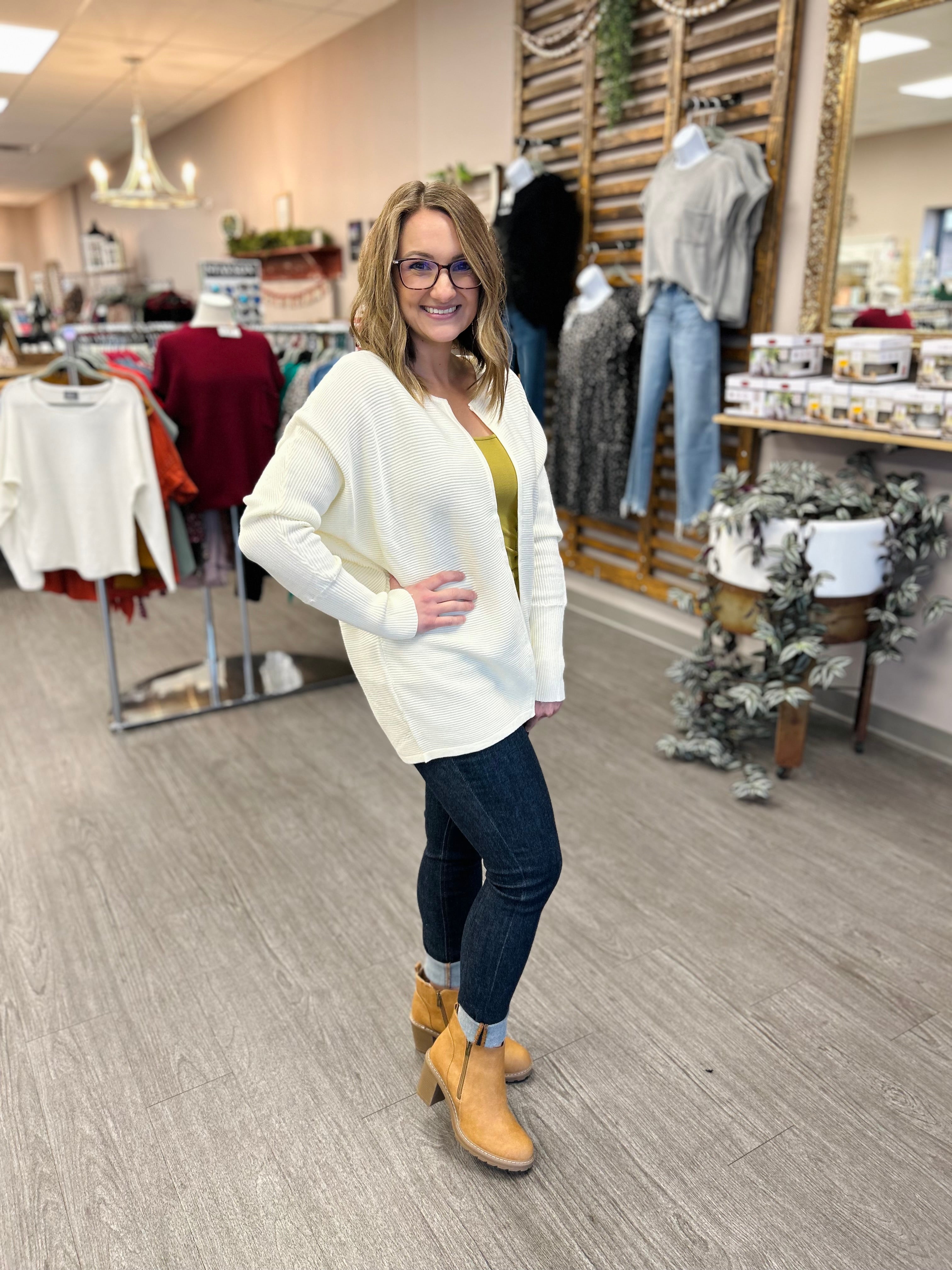 The Ivory Grace Front-Clasp Cardigan brings timeless elegance to your everyday wardrobe. Crafted in a soft, creamy ivory knit, this refined layer features a delicate front clasp that adds just the right touch of sophistication. Its lightweight design drapes beautifully, offering a polished silhouette whether worn open or secured. Perfect for pairing with dresses, tanks, or tailored denim, this cardigan elevates any look with its understated charm and versatile style. A graceful staple you’ll reach for again and again.
