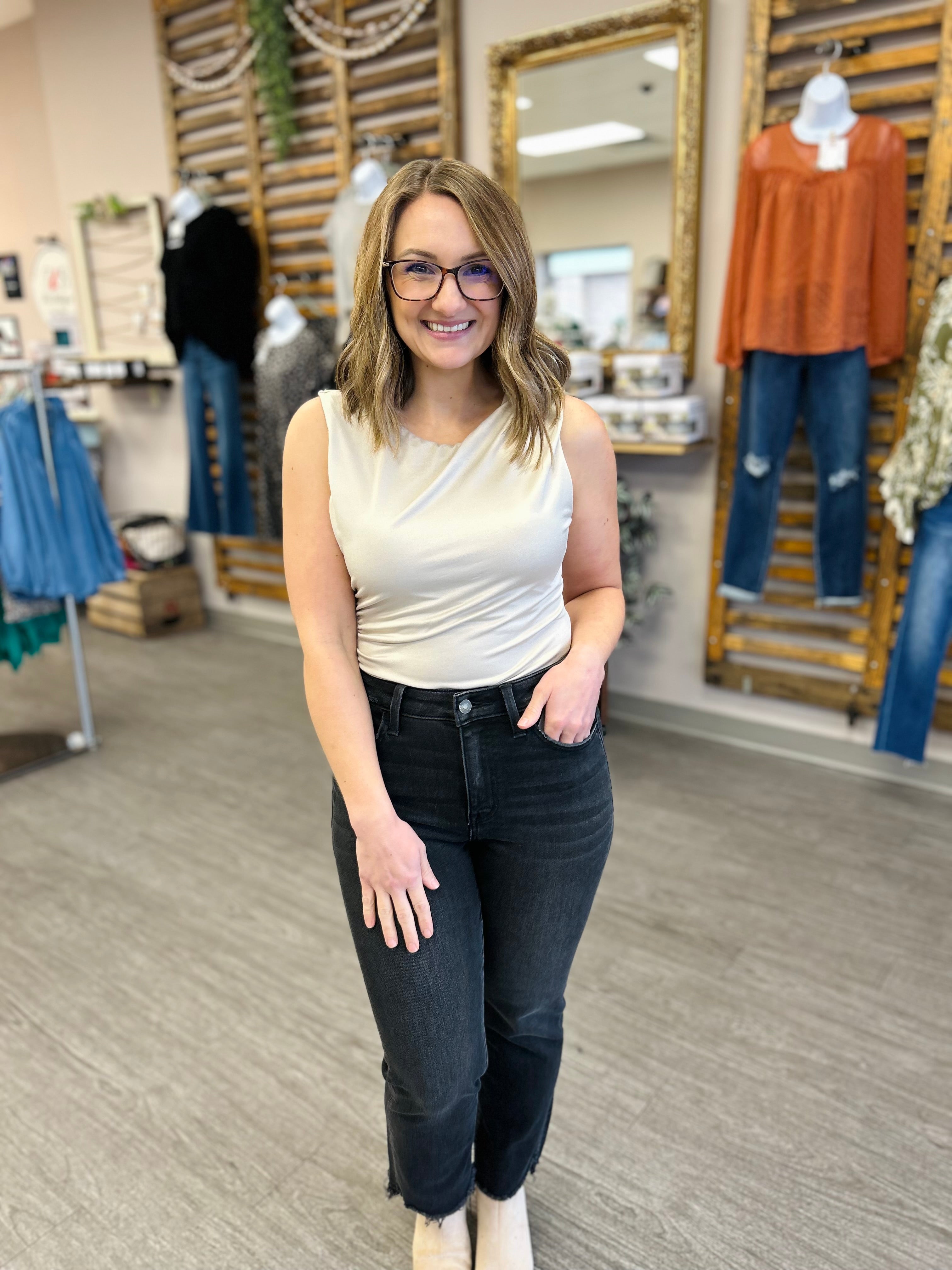 Elevate your essentials with our Sandstone Glow Sleeveless Bodysuit, designed with a sleek round neckline and refined shirting detail for a timeless look. The soft, stretchy nude-toned fabric offers a smooth, flattering fit that stays perfectly in place. A versatile neutral you can dress up or down, this bodysuit pairs effortlessly with everything from denim to tailored trousers for year-round style.