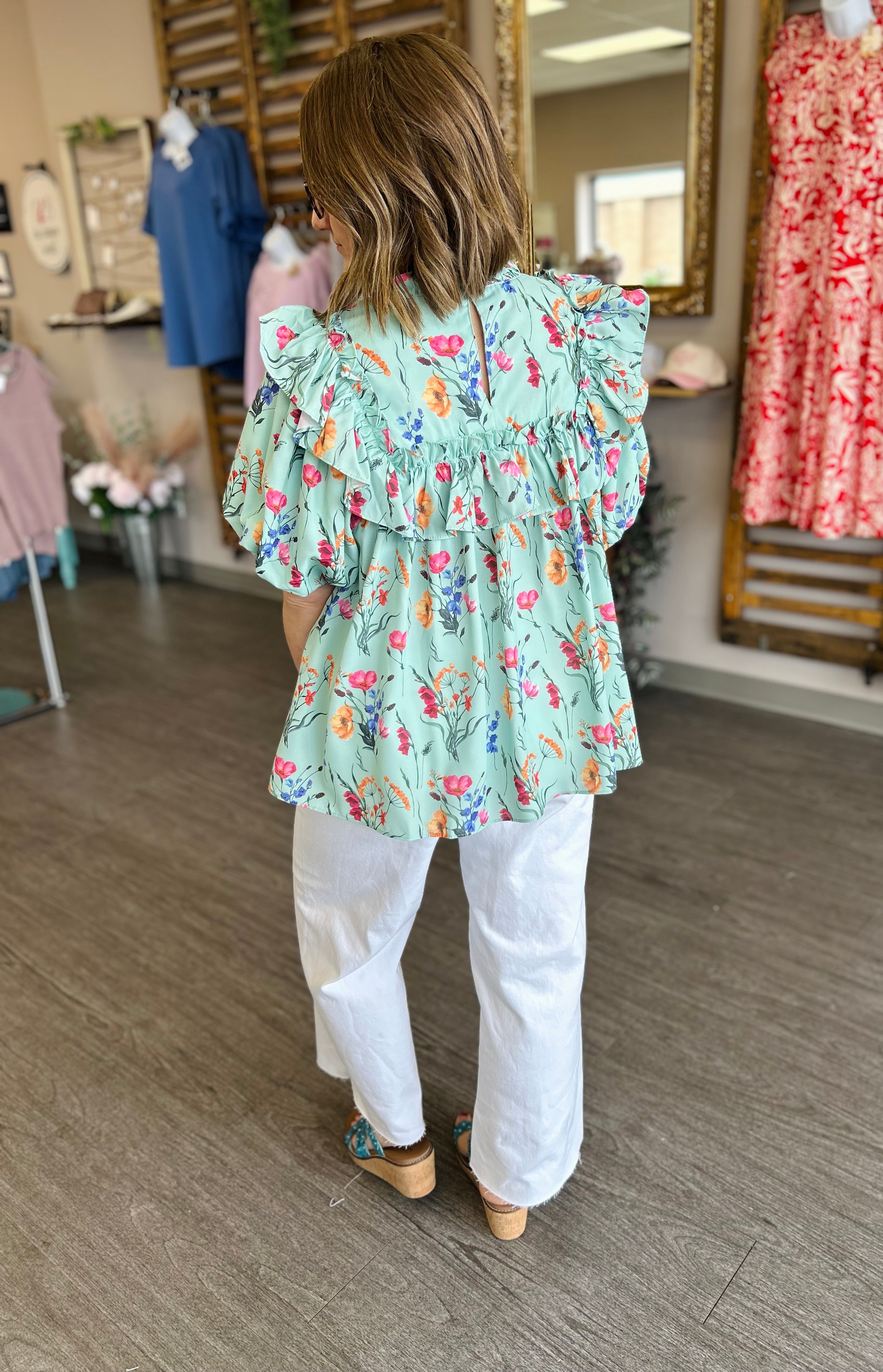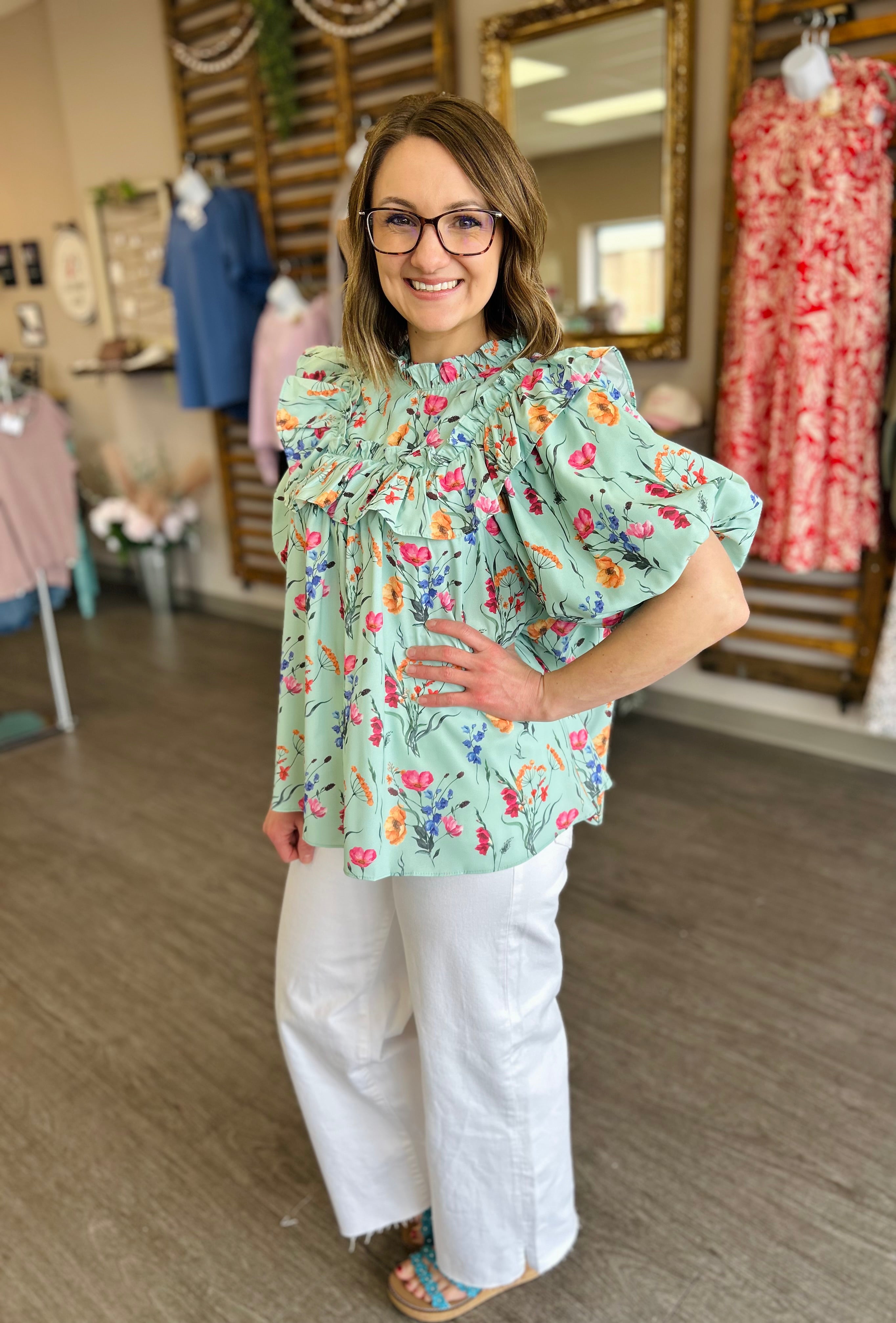 Light, feminine, and effortlessly charming, the Soft Meadow Puff Sleeve Top brings a touch of springtime freshness to your wardrobe. Crafted in a soft mint green with a delicate floral print, this top features playful puff short sleeves and a relaxed silhouette for a flattering, airy fit. The lightweight fabric ensures all-day comfort, making it perfect for pairing with jeans, skirts, or shorts. Whether worn for casual outings or sunny weekend adventures, this top adds a soft, joyful pop of color and whimsical charm to any outfit.