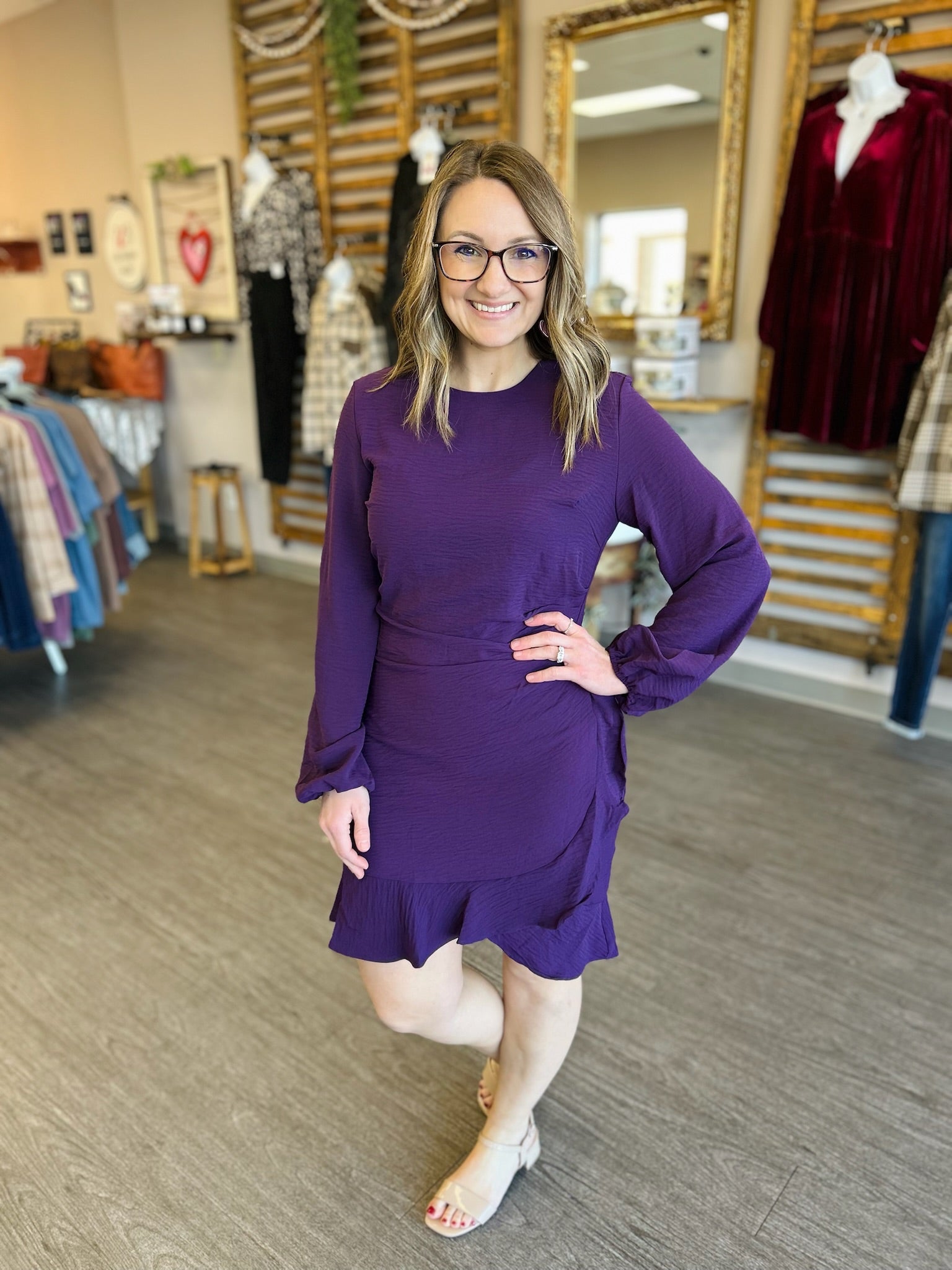 The Deep Orchid Ruffle Dress brings romantic movement and rich color together in one effortlessly elegant silhouette. Crafted in a lush deep purple hue, this dress features a playful ruffle hem that adds soft, feminine flair with every step. The flattering fit creates a graceful drape, making it perfect for seasonal celebrations, date nights, or special occasions. Pair it with heels for a refined look or boots for a chic, modern twist—the Deep Orchid Ruffle Dress adds a touch of sophistication wherever you go.