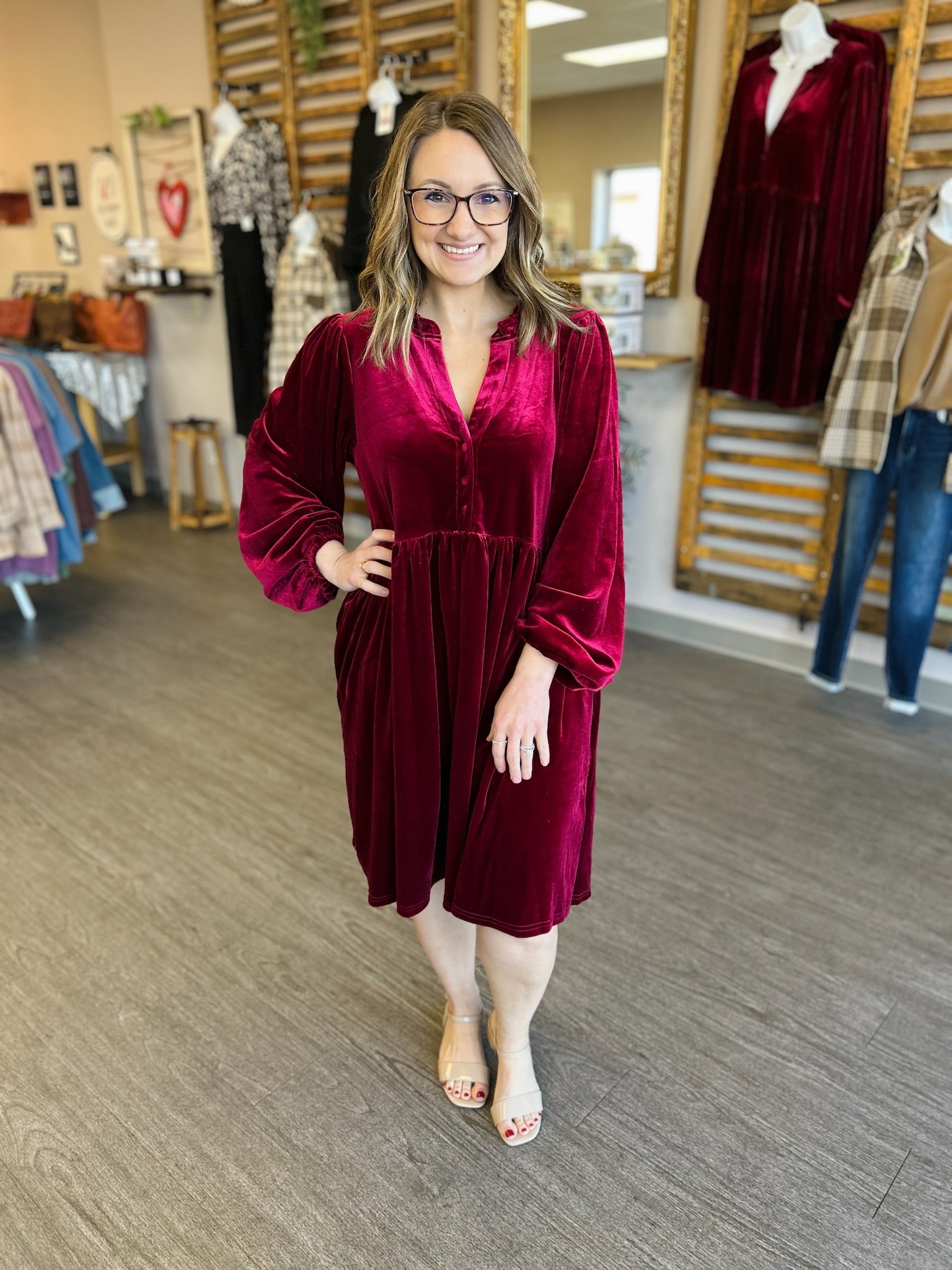 The Velvet Rose Babydoll Dress exudes romantic charm with a touch of luxe elegance. Crafted from rich burgundy velvet, this dress features a flattering babydoll silhouette that flows gracefully for a soft, feminine look. Its lightweight stretch ensures comfort while the plush fabric adds depth and sophistication. Perfect for date nights, special occasions, or holiday celebrations, the Velvet Rose Babydoll Dress pairs beautifully with heels or boots, making it an effortlessly chic choice for any occasion.