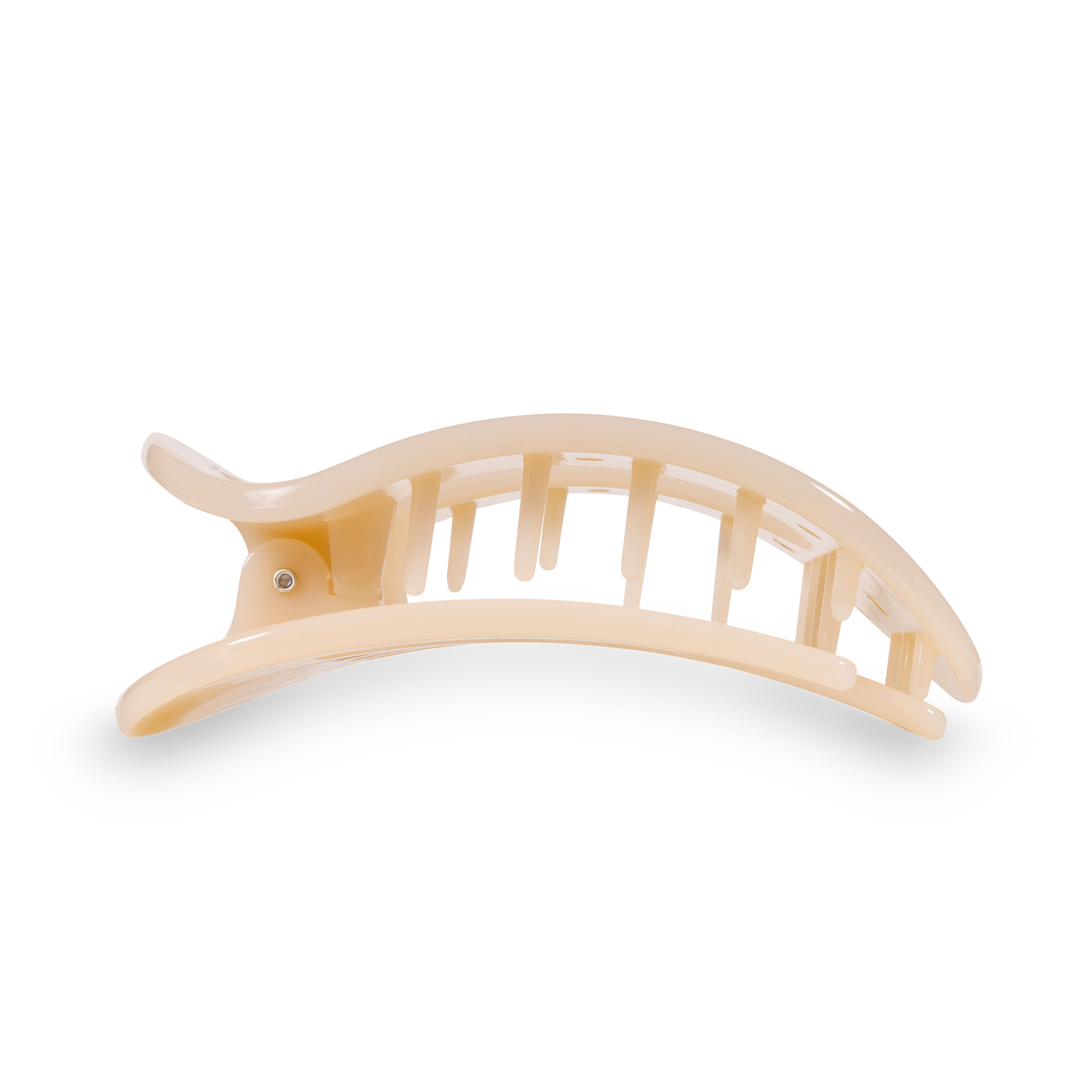 Lay flat and relax with the new TELETIES Almond Beige Medium Flat Round Hair Clip in Beige. This hair clip is designed to allow you to lay back flat, do yoga, or sit comfortably in a seat with a headrest, and it is made with the same material that is nearly unbreakable. Lay down flat with comfort Bendable teeth for a secure yet gentle hold Lightweight, durable, and hair-friendly Perfect for all-day wear—from sunup to sundown Medium clips are great for thick to medium thickness of hair.