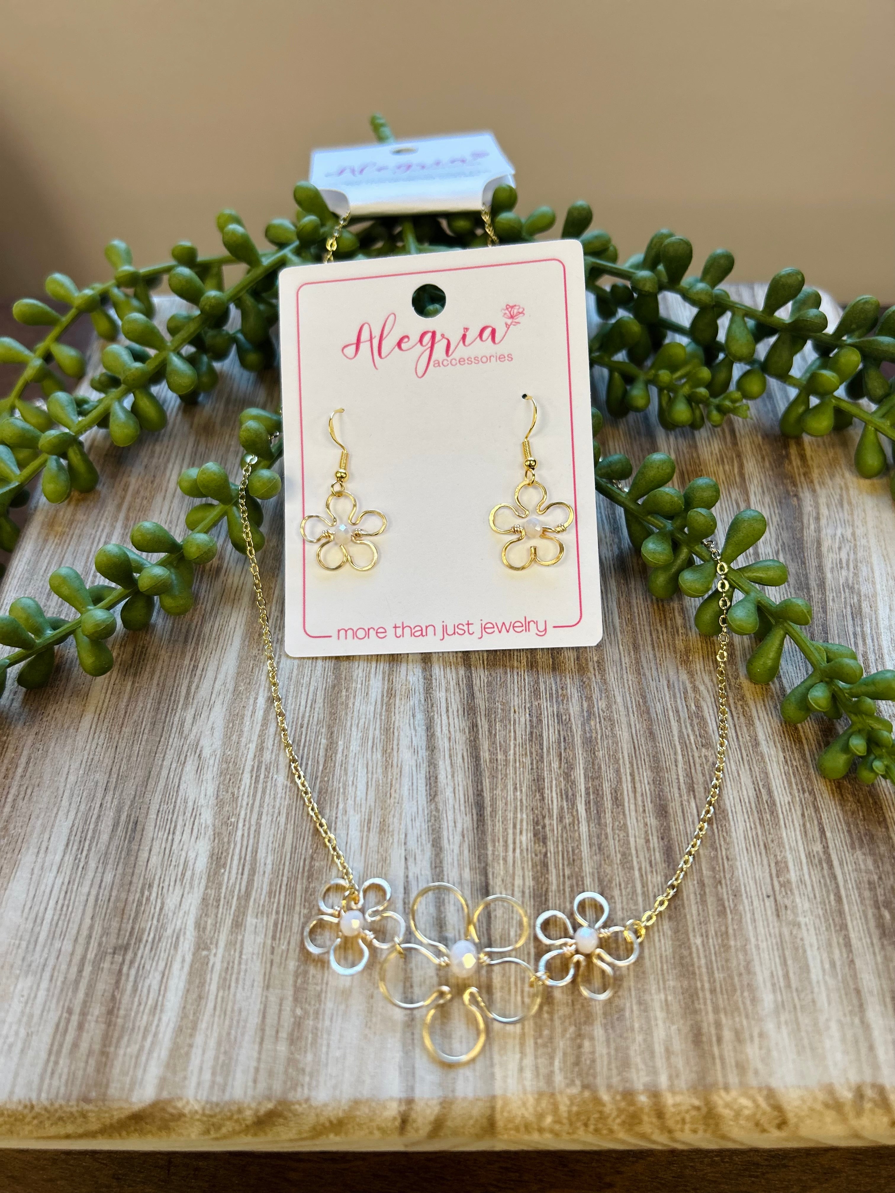 A one inch hammered gold wire flower is surrounded by two 3/4 inch hammered gold wire flowers, all with white crystal centers. Gold cable chain, a lobster clasp and extender create a 16 1/2 to 19 1/2 inch adjustable necklace. Complete your look with the matching Azalea earrings and Daisy bracelet.