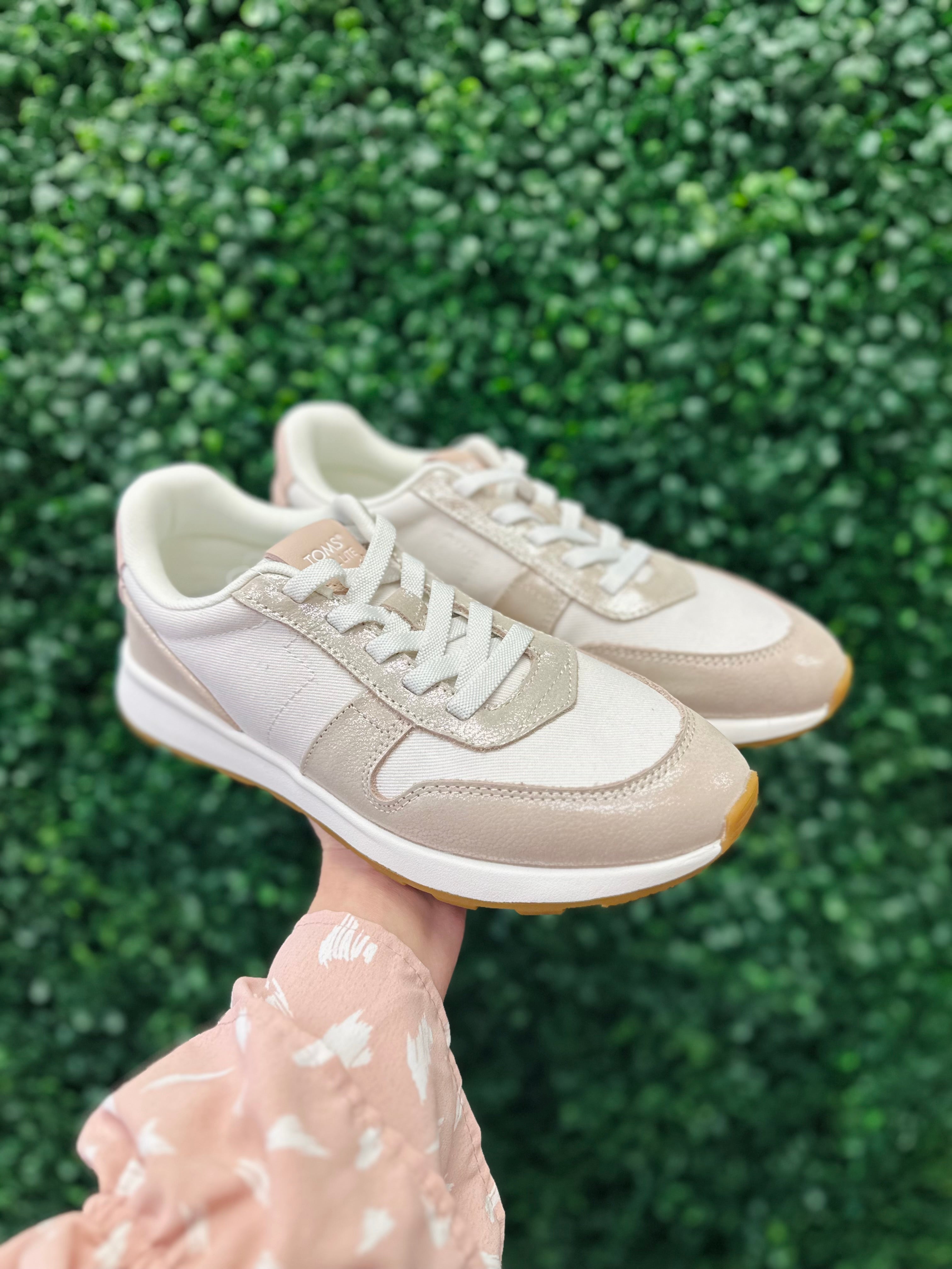 Step into effortless style and all-day comfort with the Toms Retro Champagne Vintage Twill Shimmer Sneaker. Featuring a sleek suede and twill upper, retro-inspired design, and a cushioned insole, these lightweight sneakers are perfect for casual days, travel or weekend adventures. The versatile neutral tone pairs easily with jeans, dresses, or activewear, while the pop of shimmery pink adds a modern touch. Finished with a durable rubber outsole for traction, these sneakers bring together fashion and function in true TOMS style.