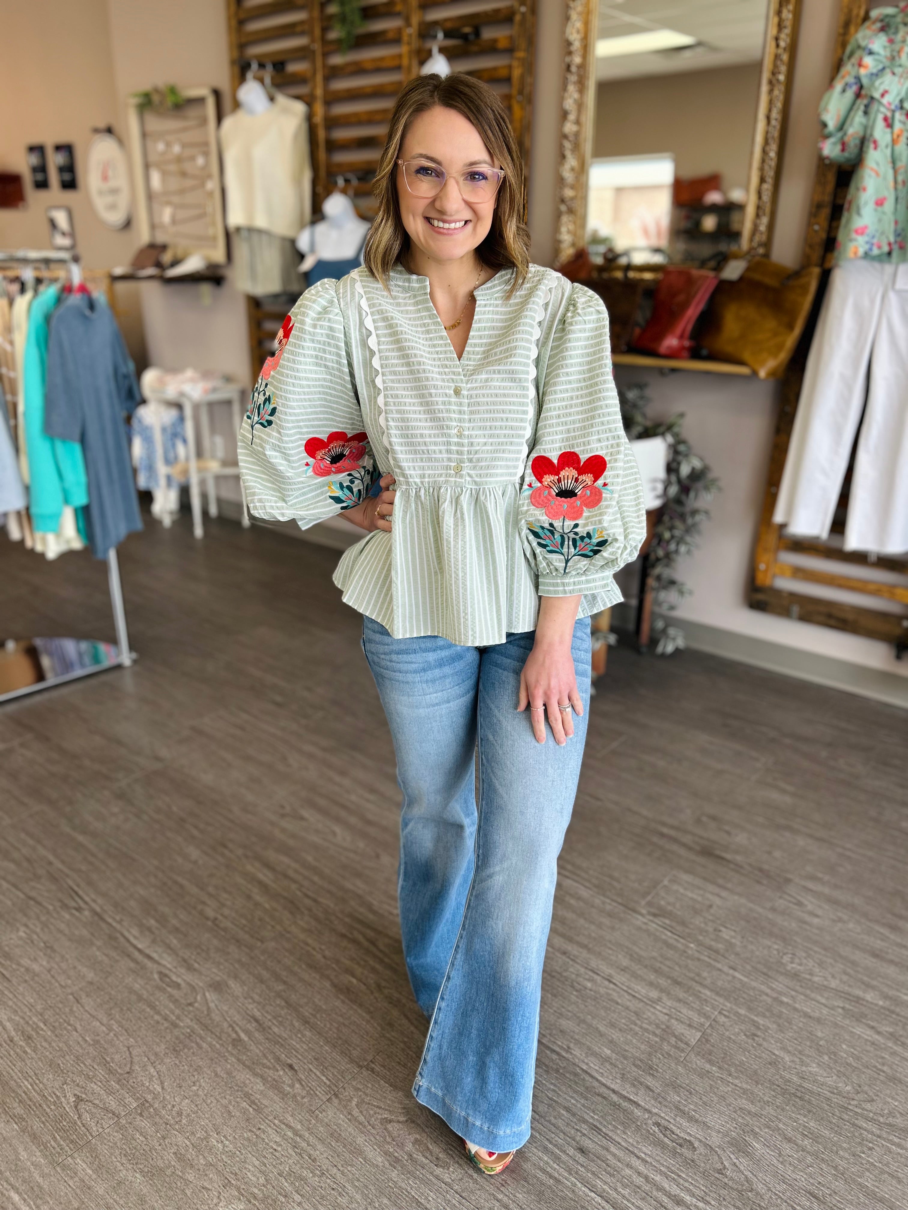 Fresh, feminine, and full of charm, the Blooming Breeze Puff Sleeve Top is a standout piece for effortless everyday style. Designed with soft sage and white stripes, this top features voluminous puff sleeves adorned with beautiful embroidered flowers that add a delicate, eye-catching touch. The lightweight feel and relaxed silhouette make it as comfortable as it is stylish. Pair it with your favorite denim or white bottoms for a look that feels breezy, polished, and perfect for the season.