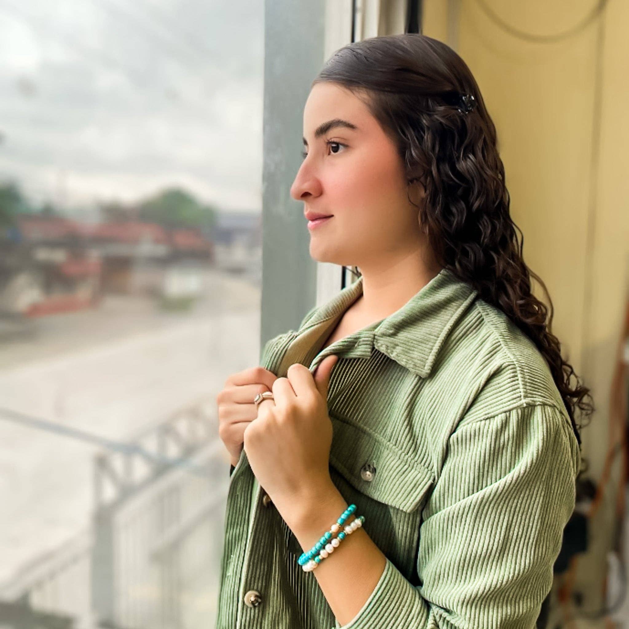 Turquoise and freshwater pearls are paired together with gold spacer beads in this stretch bracelet set. Fits 6 1/2 - 7 inch wrists.