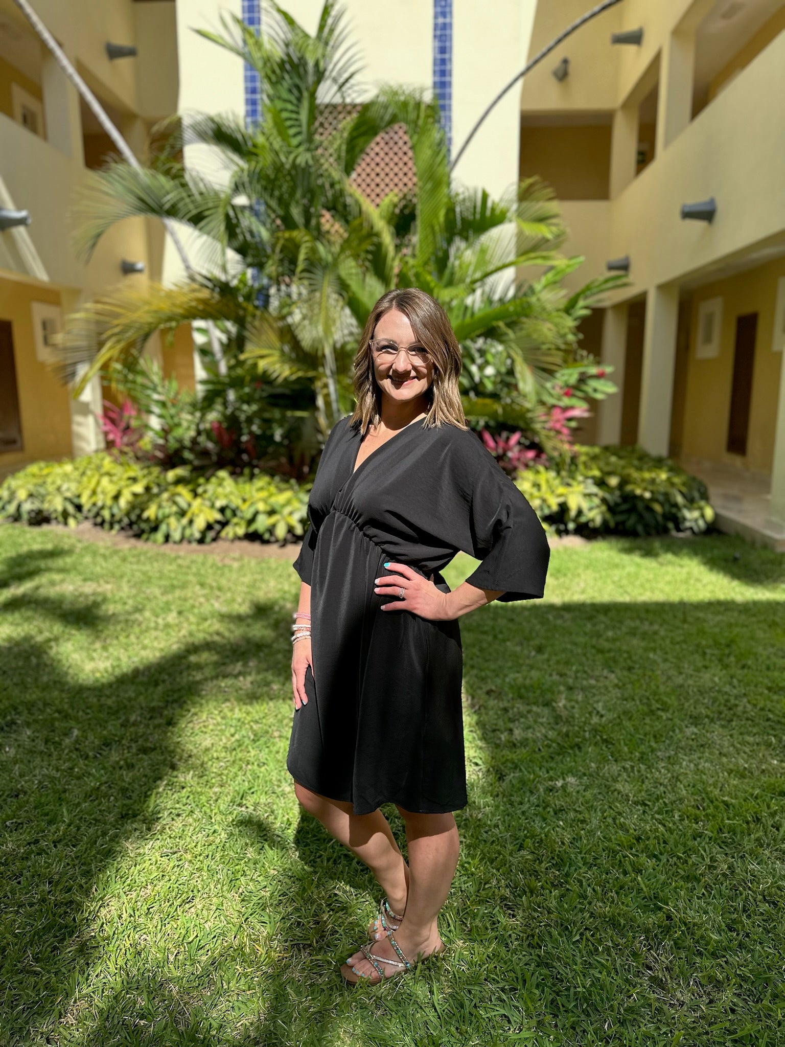 Timeless, elegant, and effortlessly versatile, the Classic Allure Dress is a wardrobe essential you’ll reach for again and again. Featuring a flattering V-neckline and short sleeves, this black dress offers a sleek, streamlined silhouette that works for any occasion—from casual outings to evening events. Crafted from a soft, comfortable fabric, it drapes beautifully while maintaining a polished look. Pair it with heels, flats, or sneakers for an effortlessly chic style that’s simple, sophisticated, and undeniably classic.