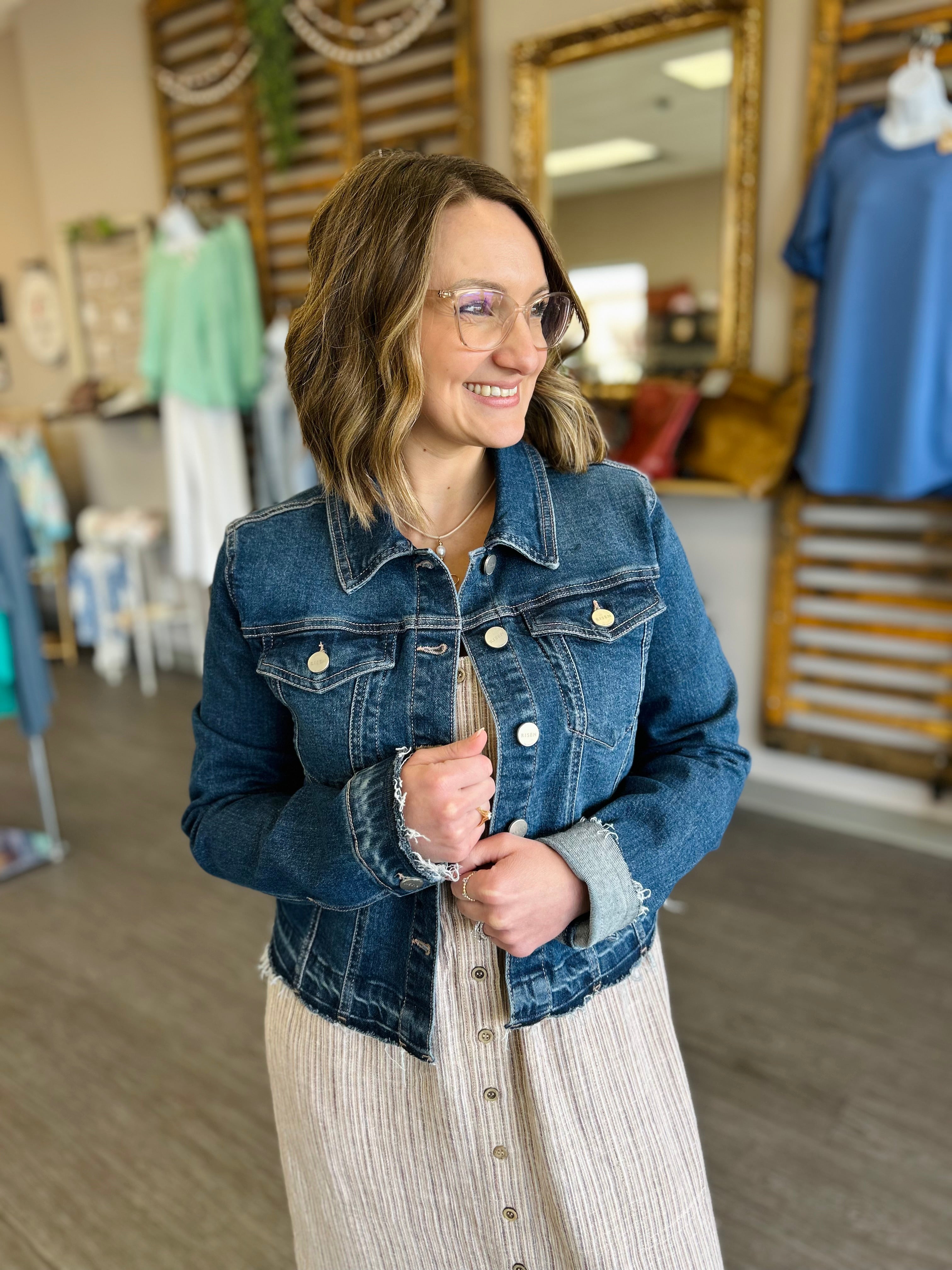 Effortlessly cool with a touch of edge, the Dark Tide Denim Jacket is a modern wardrobe essential. Crafted from dark wash denim, this jacket features raw hem details at the bottom and cuffs for a subtly distressed, contemporary look. Its classic silhouette makes it versatile for layering over dresses, tees, or sweaters, while the structured fit keeps it polished yet relaxed. Perfect for casual outings, weekend adventures, or adding a chic finishing touch to any outfit, this jacket combines timeless style with a modern, slightly rebellious twist.
