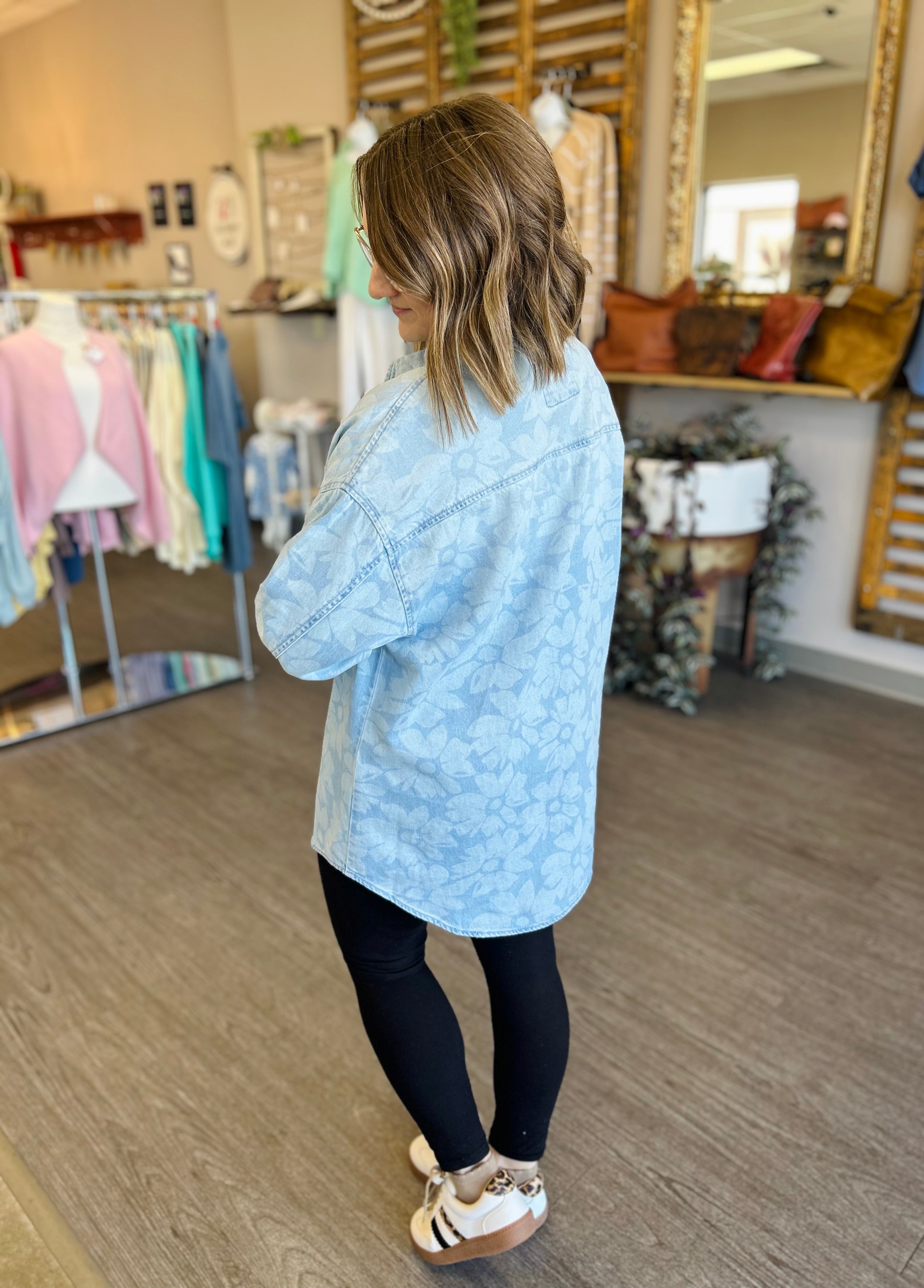 Where classic meets feminine, the Floral Fields Denim Shacket is the perfect blend of rugged and romantic. Crafted from durable denim, this versatile layer is elevated with a soft floral print that adds a fresh, eye-catching touch. Designed with a relaxed fit, it’s easy to wear as a lightweight jacket or buttoned up as a statement top. Perfect for layering over tees, tanks, or dresses, this shacket brings effortless charm to any outfit. Whether you're heading out for a casual day or a weekend getaway, it’s the perfect piece to add a little bloom to your look.