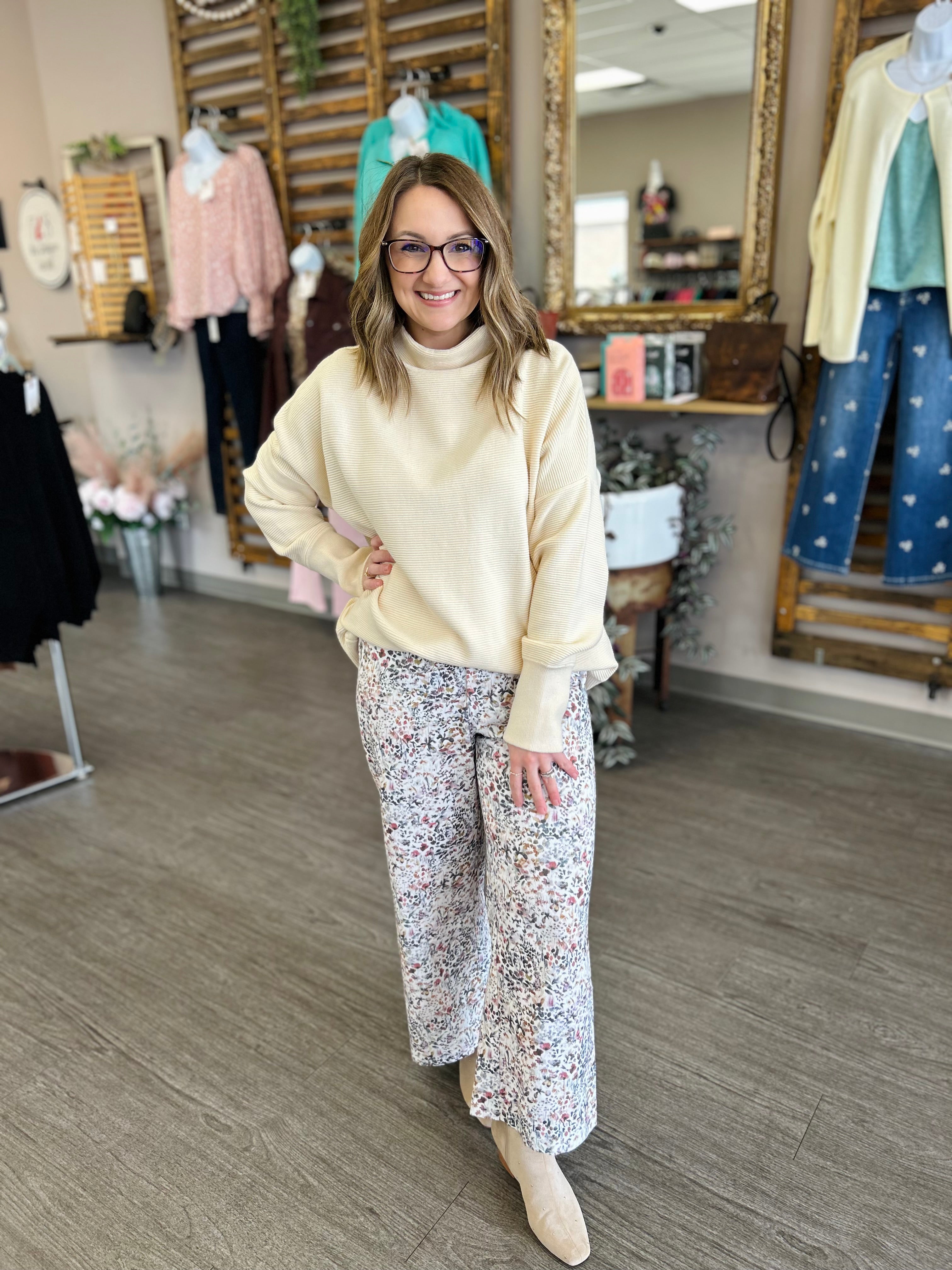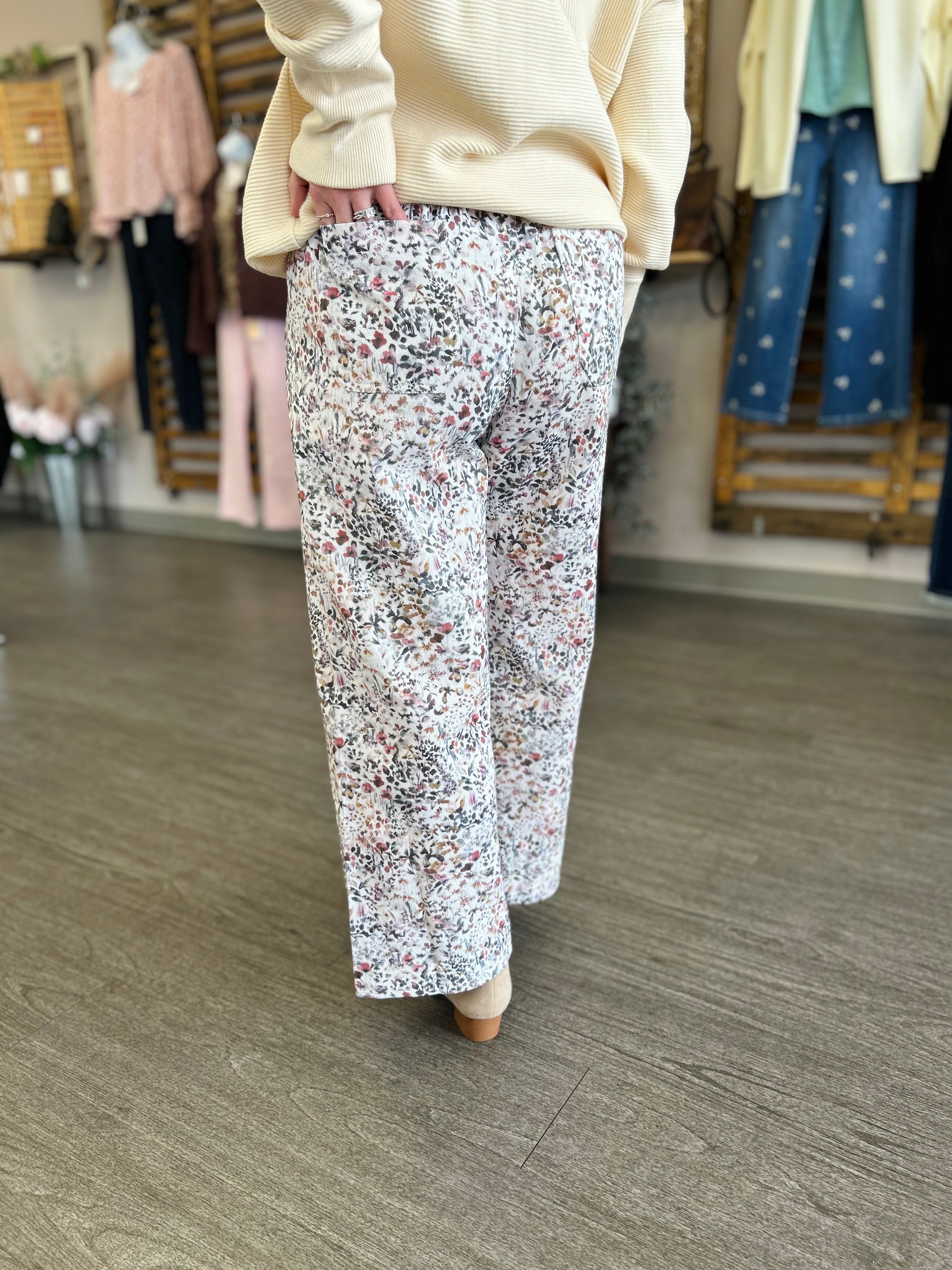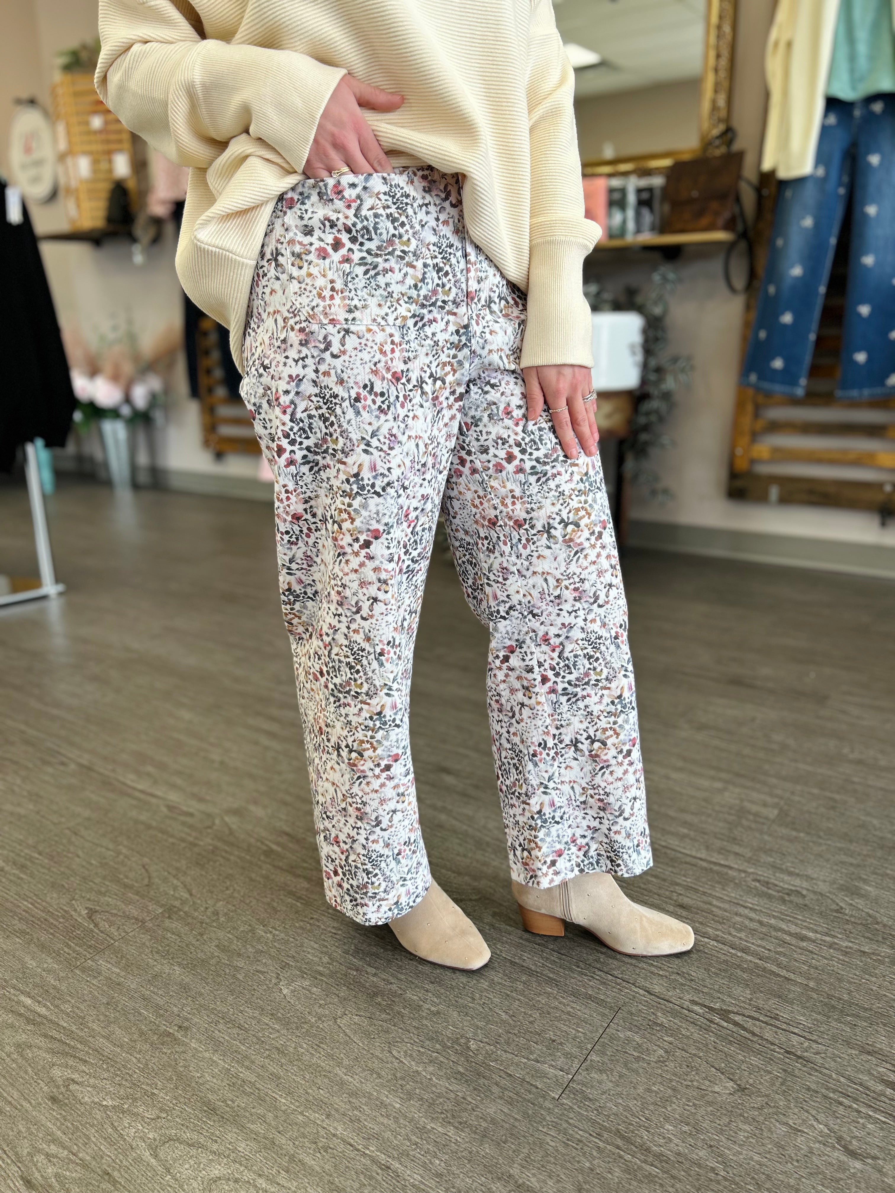 The Garden Daydream Pants are the perfect blend of comfort and feminine charm. Designed with an easy pull-on waist for all-day wear, these pants feature a soft ivory base adorned with a delicate floral print for a fresh, romantic feel. The relaxed silhouette drapes beautifully, making them effortless to style with simple tees, lightweight knits, or breezy blouses. Whether you’re strolling through the day or enjoying a laid-back weekend, these pants bring dreamy comfort and timeless style to any look.