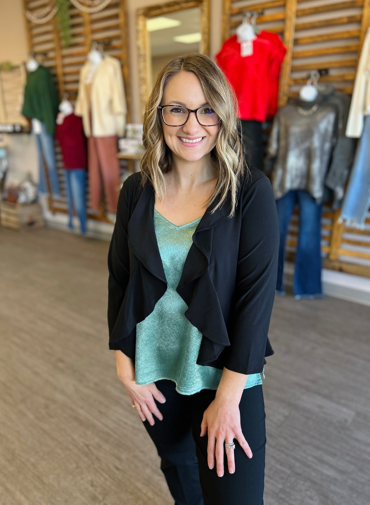 A timeless classic with a flirty twist — our Little Black Ruffled Blouse is the perfect blend of elegance and ease. Featuring a soft open-front design with delicate ruffle detailing, this blouse adds just the right amount of feminine charm. Pair it with denim for a chic daytime look or dress it up with trousers for an evening out! Layering made easy!