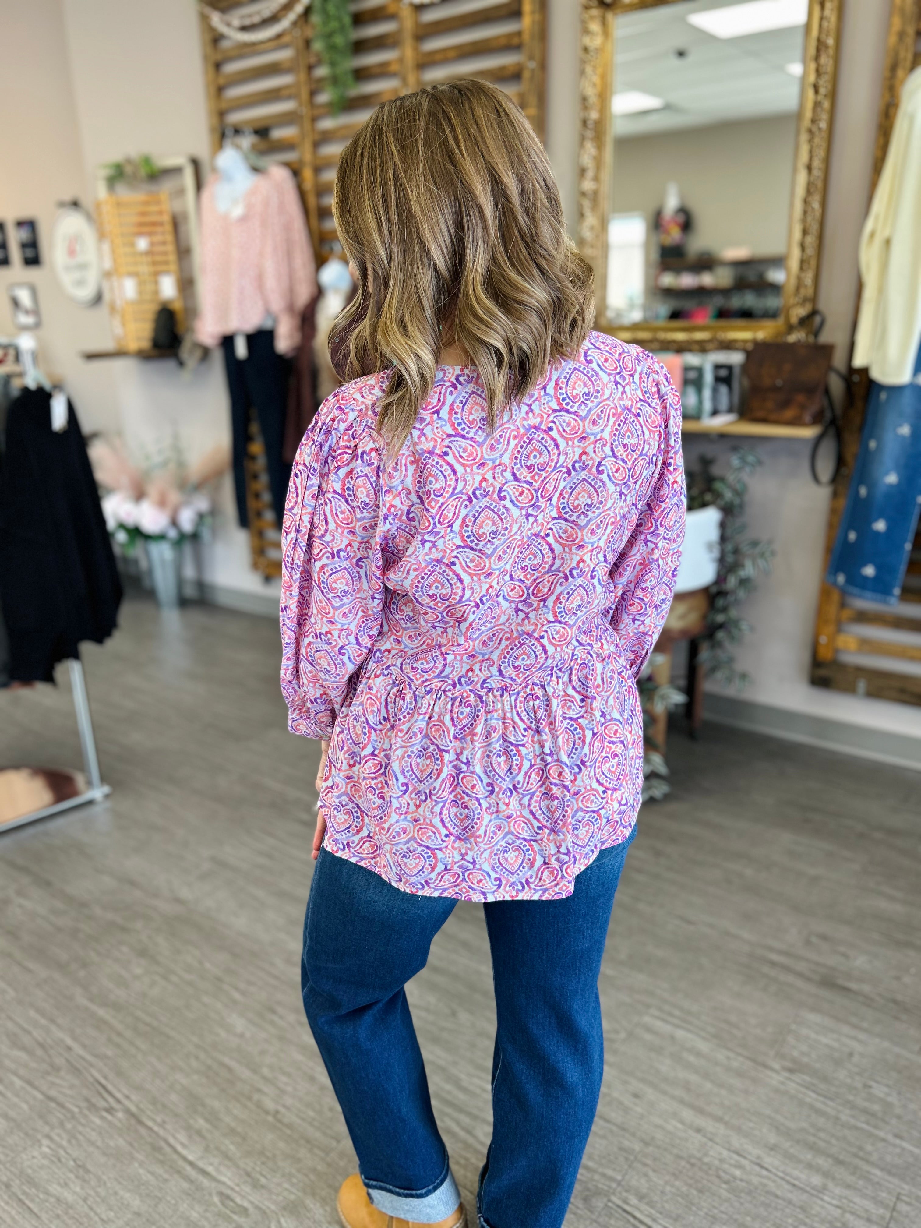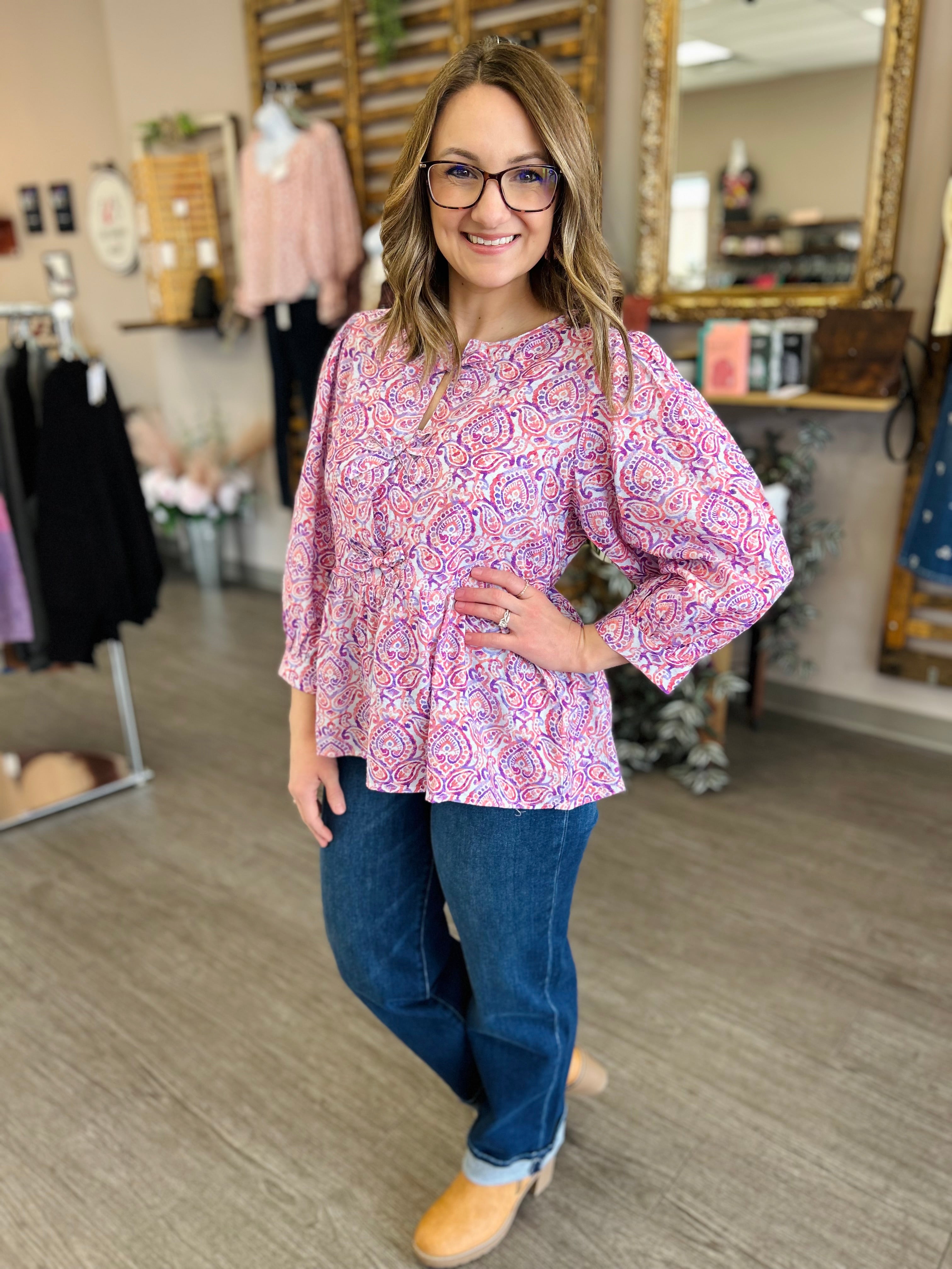 The Magenta Whirl Tie Blouse is a playful and eye-catching piece that blends vibrant color with effortless style. Crafted on a crisp white base, it features a lively magenta, pink, and purple paisley print, bringing a whimsical, feminine touch. The front is accented with three delicate ties, adding adjustable detail to the silhouette. Lightweight and breezy, this top pairs beautifully with denim or tailored pants, making it perfect for casual days, brunch outings, or layered looks with effortless charm.