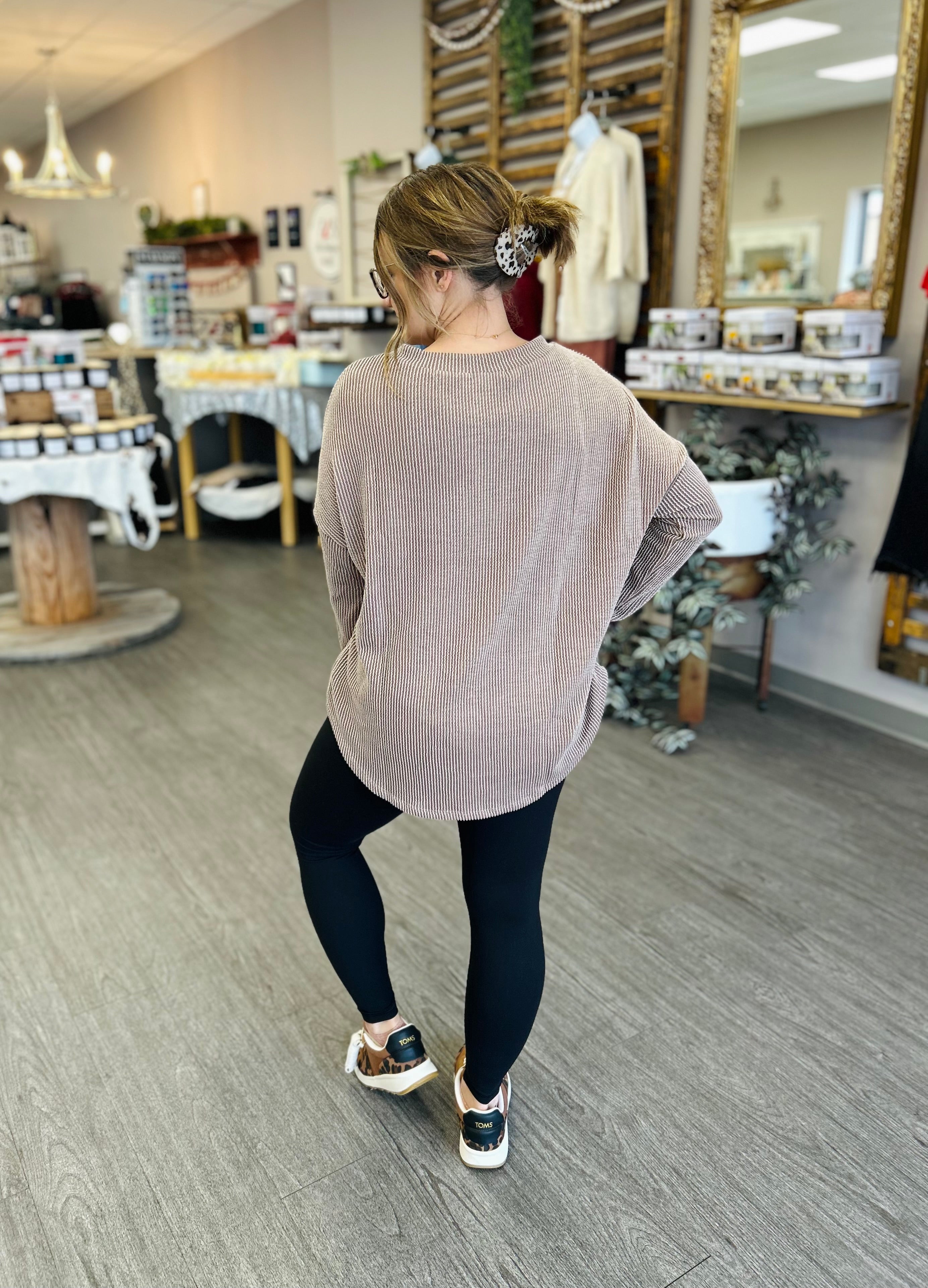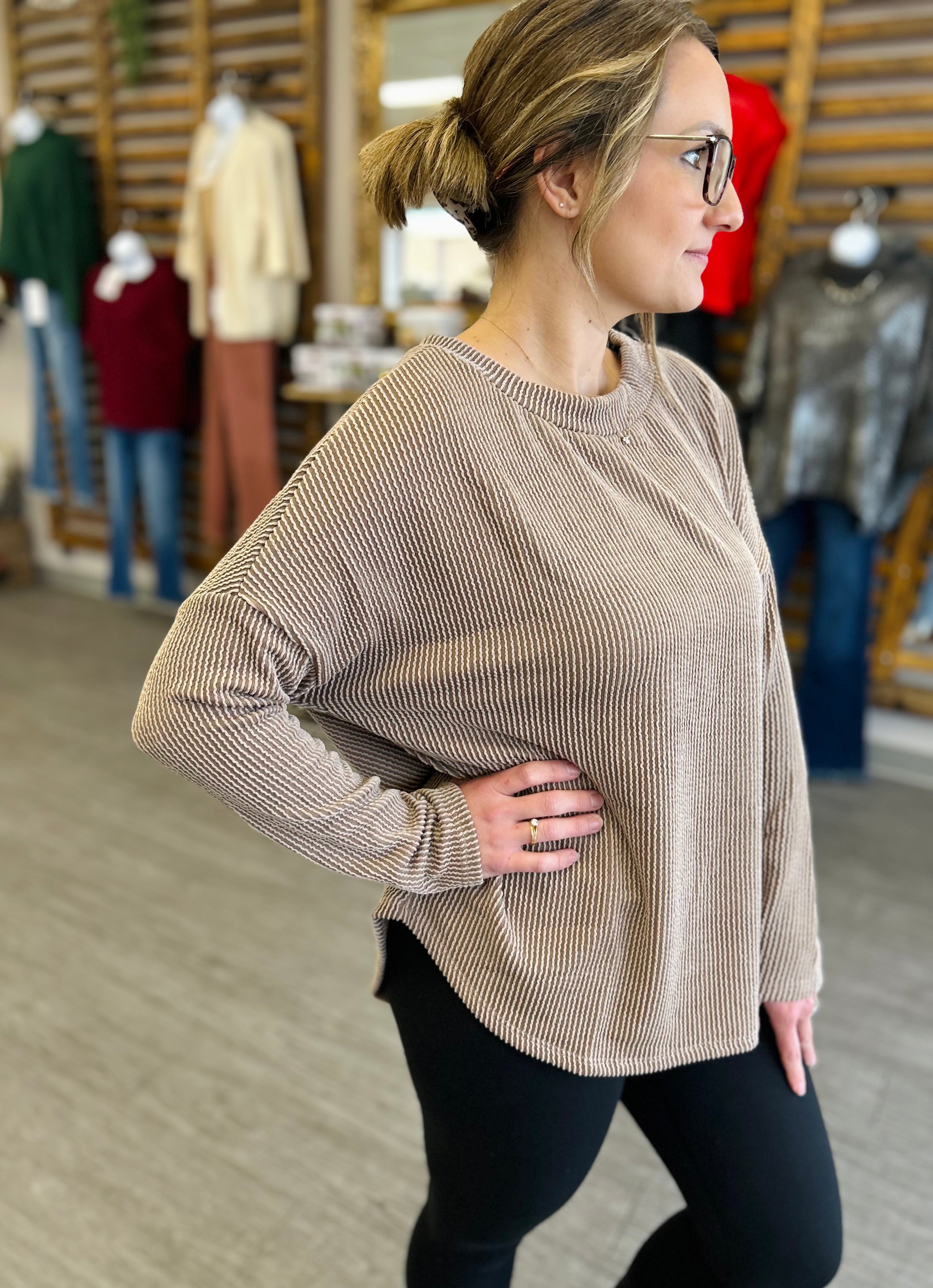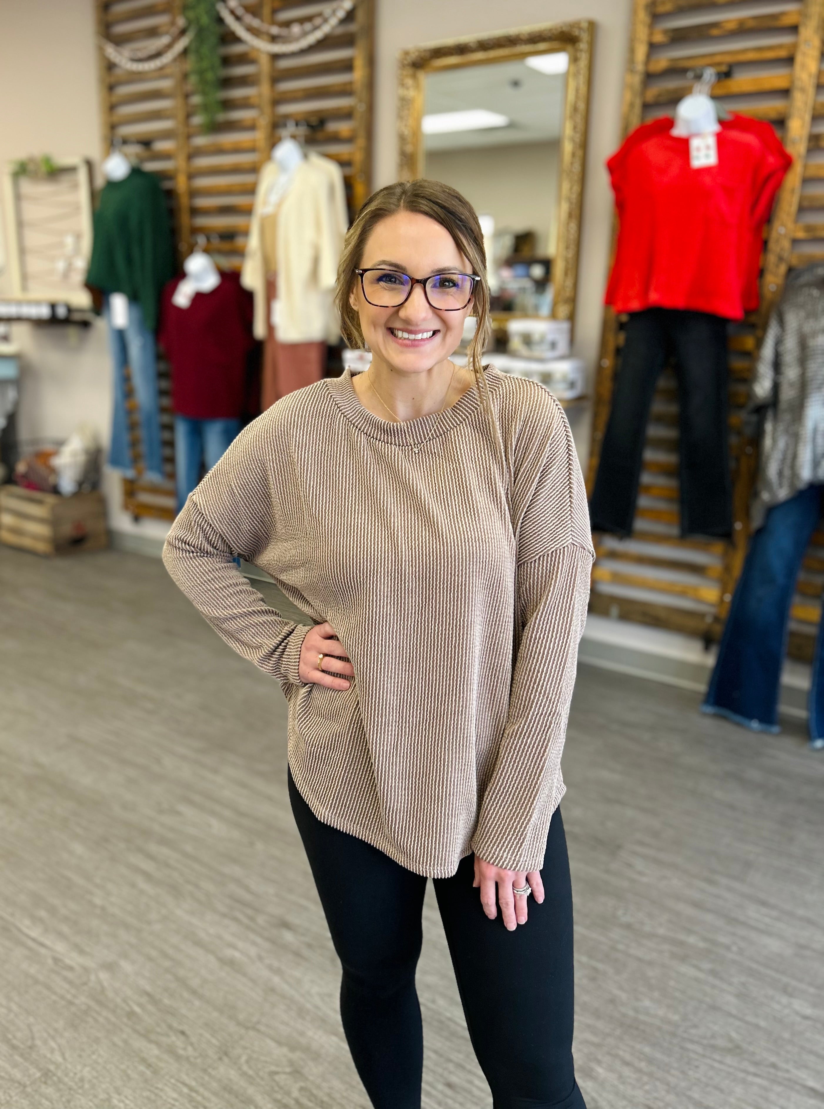 Wrap yourself in the effortless comfort of our Mocha Moments Top. This soft knit features a warm mocha hue and an easy, flattering fit that makes it perfect for layering or lounging. Dress it up with denim and booties or keep it casual with leggings — either way, it’s the comfy-chic piece you’ll reach for again and again.