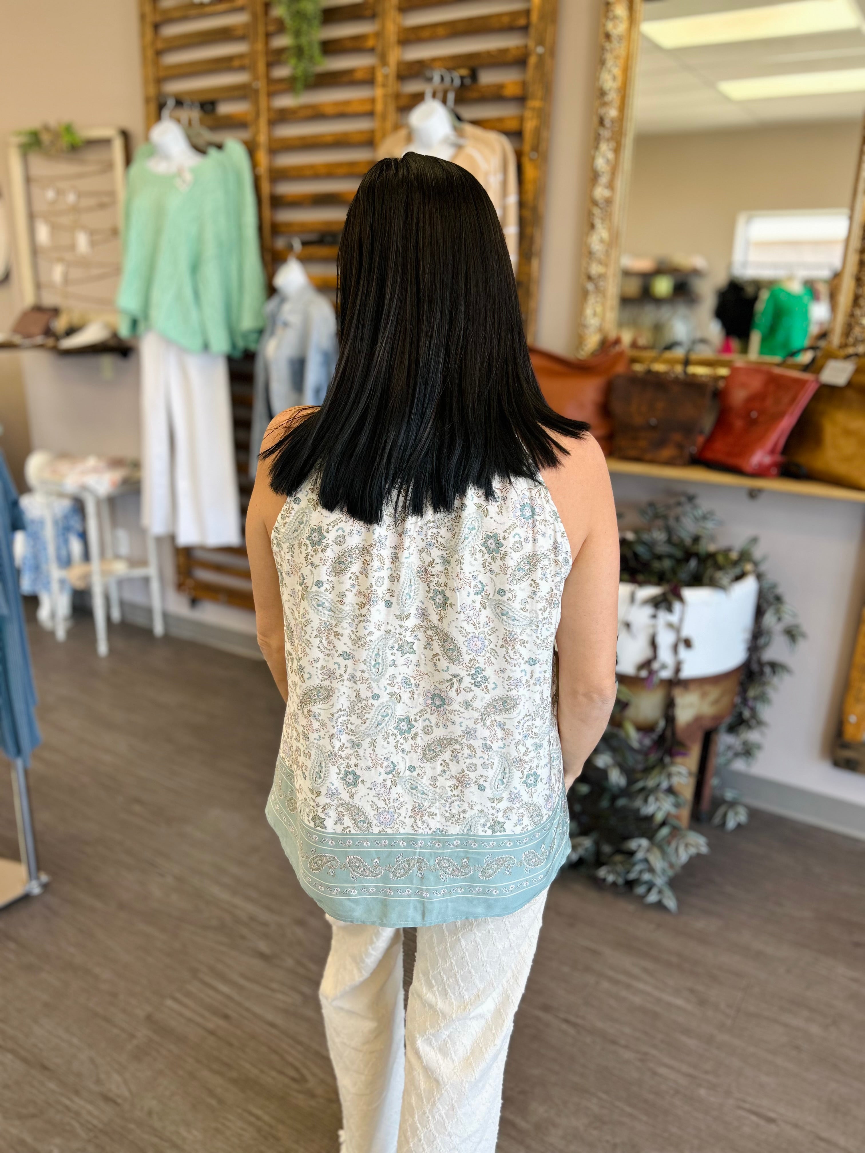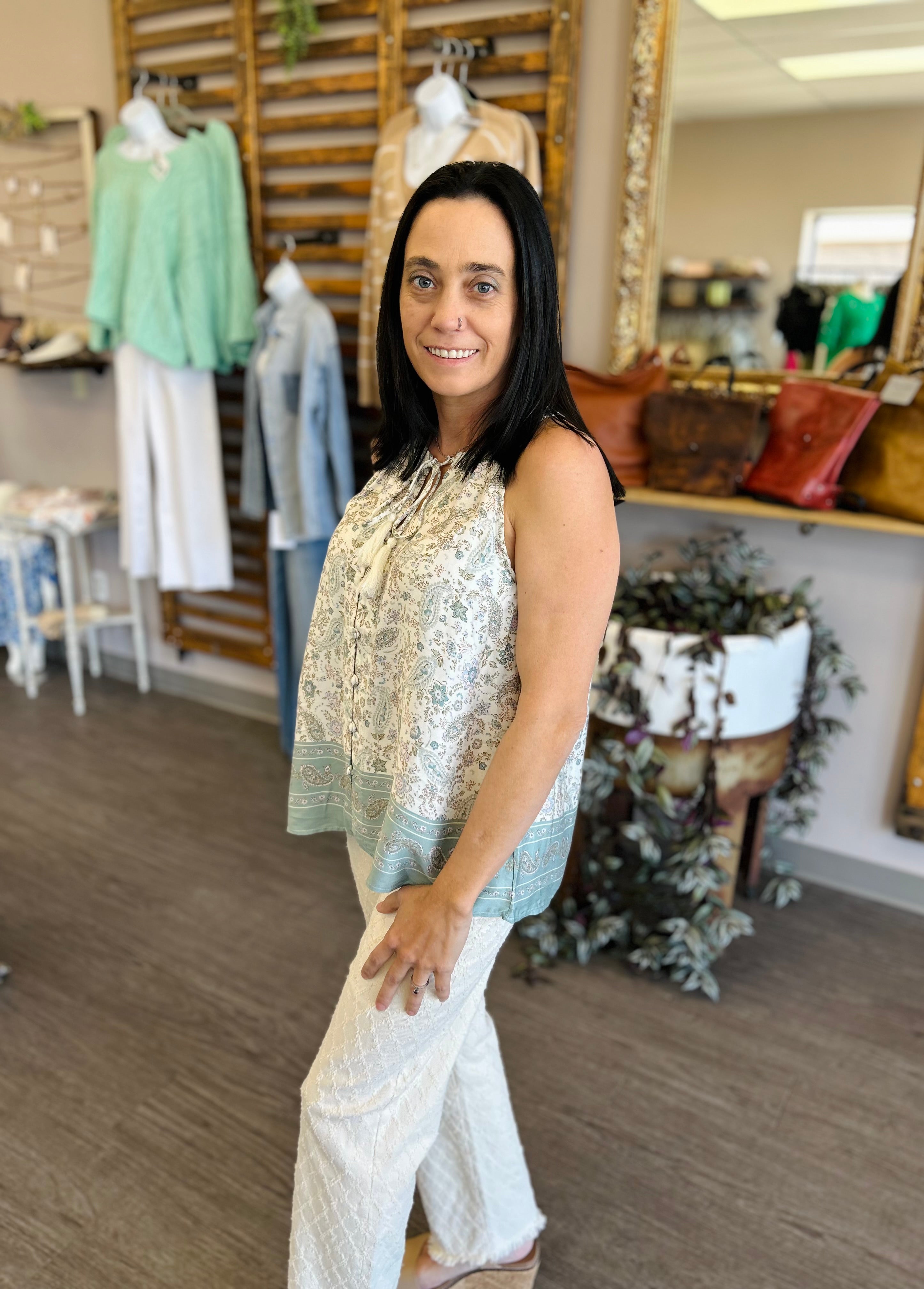 Effortlessly boho with a touch of elegance, the Paisley Oasis Top is your go-to for warm, sunny days. Featuring a soft blend of cream, sage, and tan in a timeless paisley print, this halter-style top brings a natural, earthy charm to your look. The tie-neck detail adds a feminine touch while allowing for an adjustable, flattering fit. Lightweight and breezy, it pairs perfectly with denim, linen pants, or skirts for an easy, polished outfit. Whether you're headed to brunch, a getaway, or a day out, this top delivers relaxed style with a chic, free-spirited vibe.