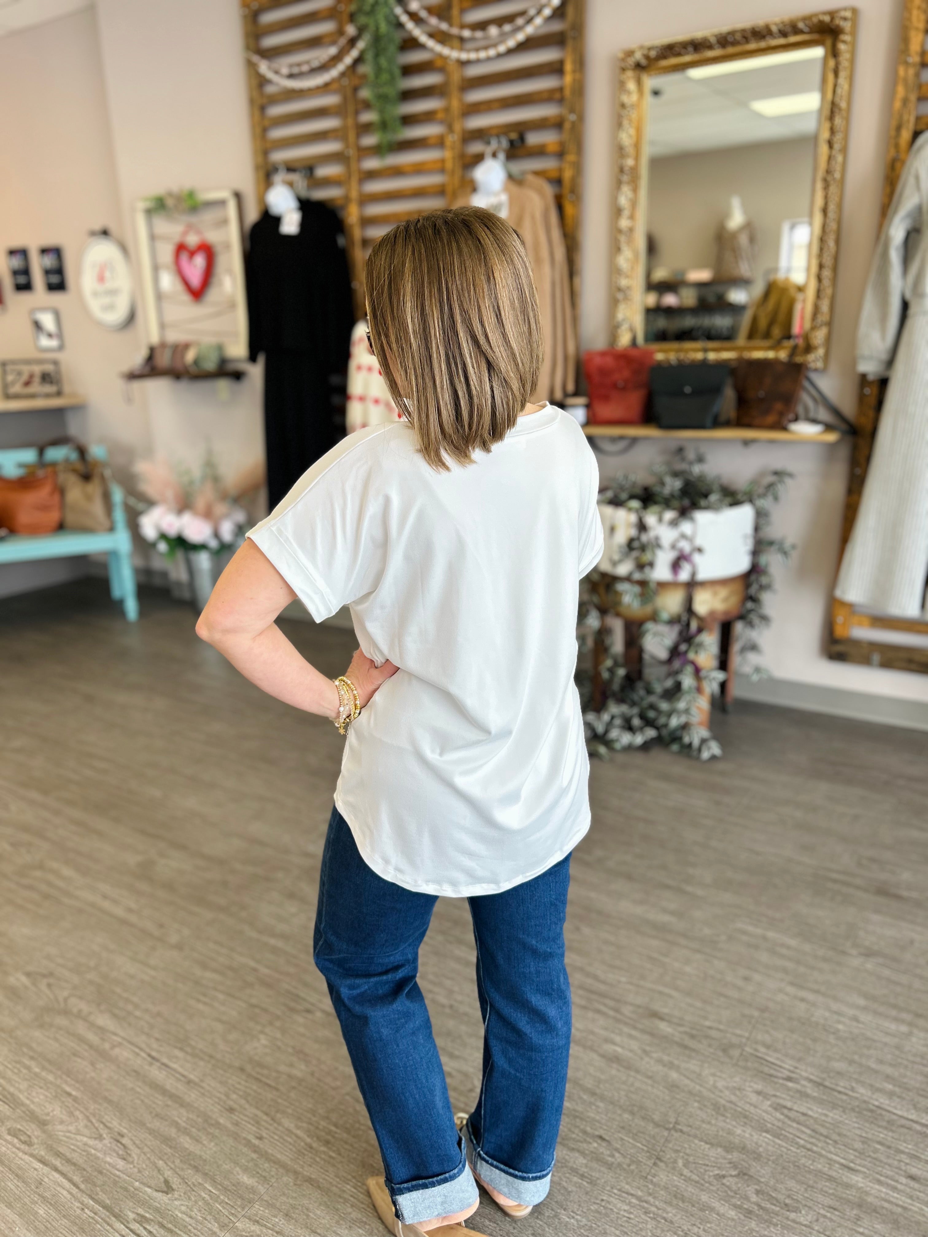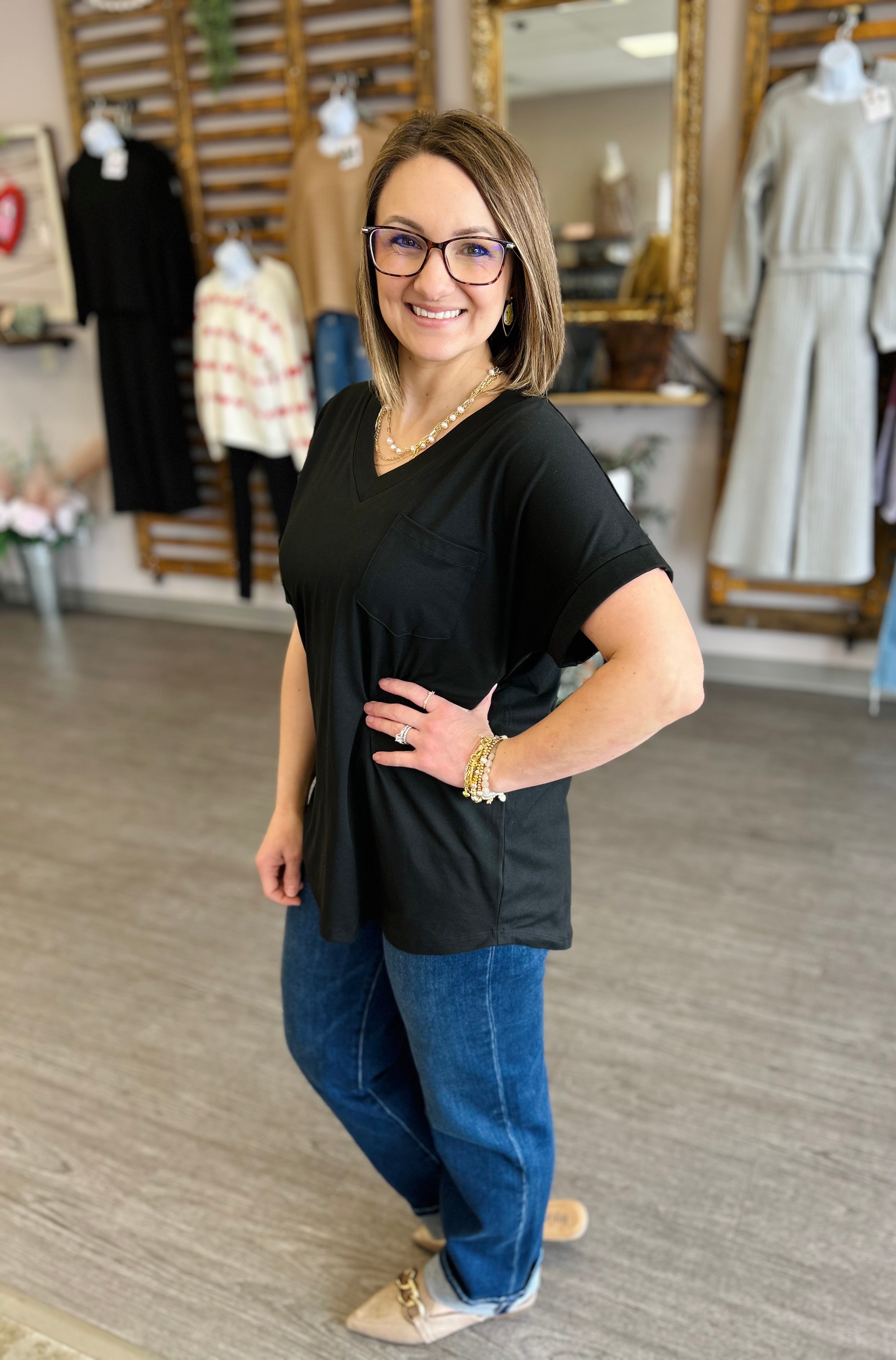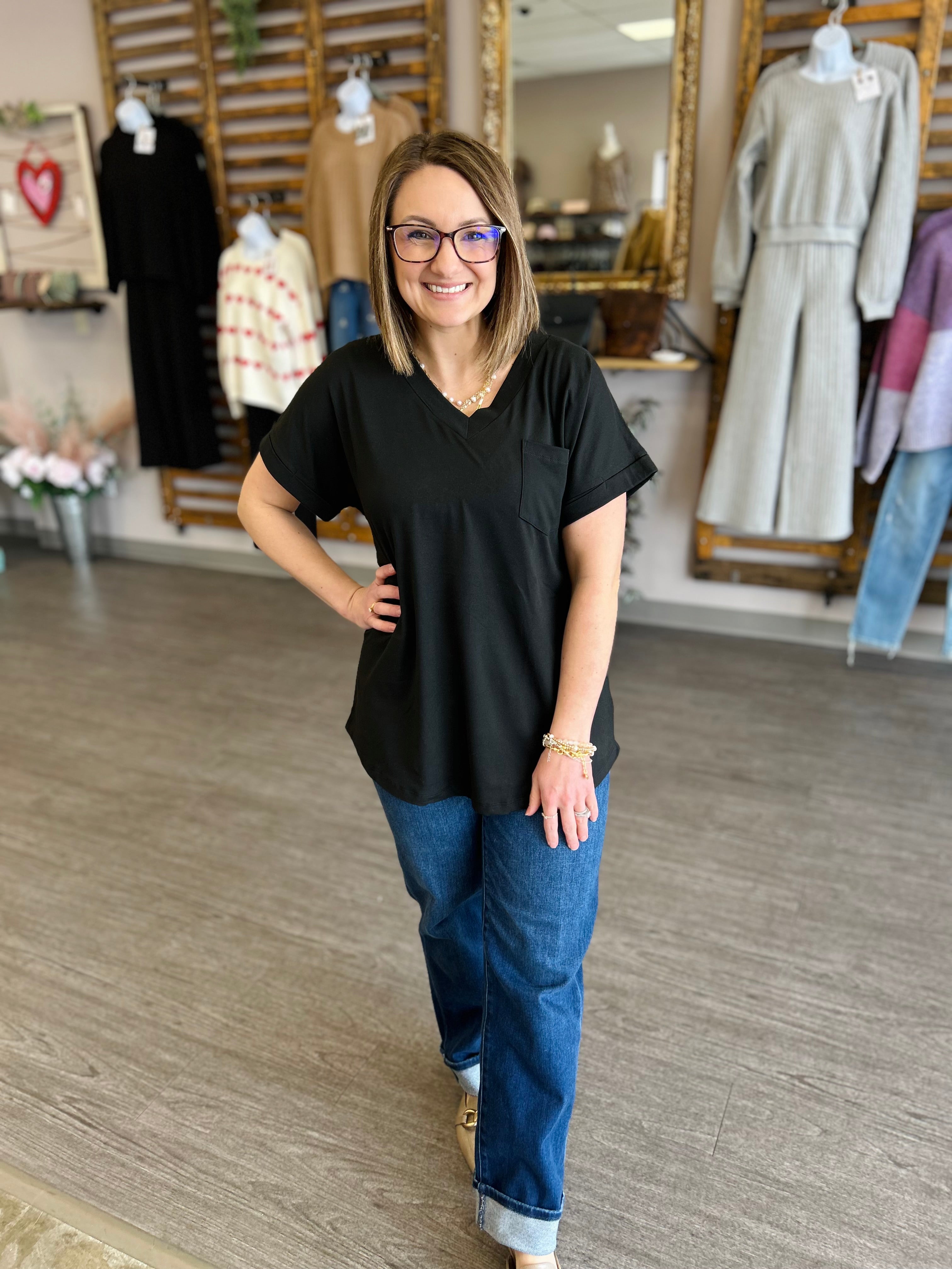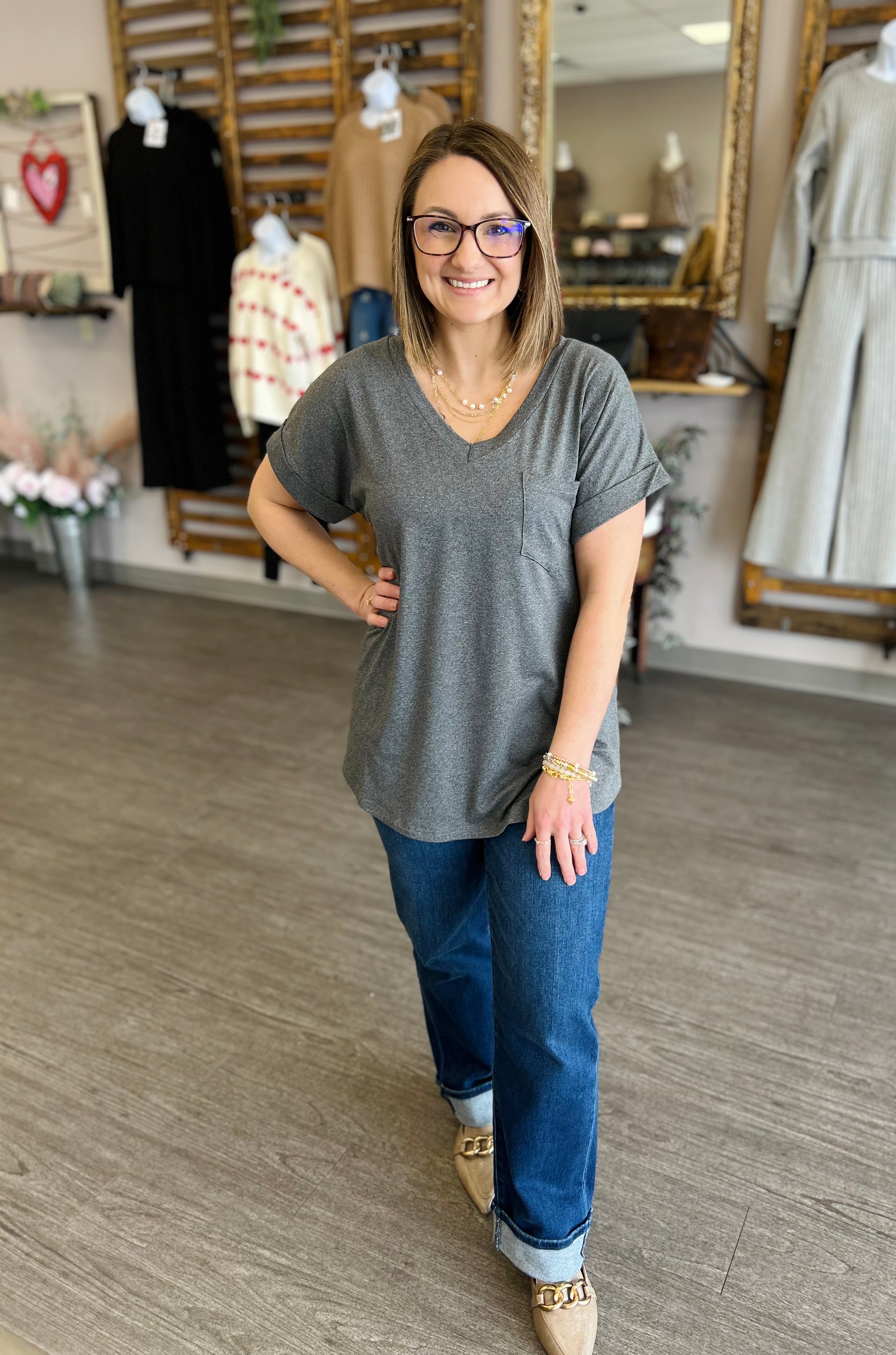 Our soft knit easy pocket tee features a v neckline, single pocket, rolled cuff detailed sleeve and a curved hem. This tee is a relaxed fit tee. Made in the USA!