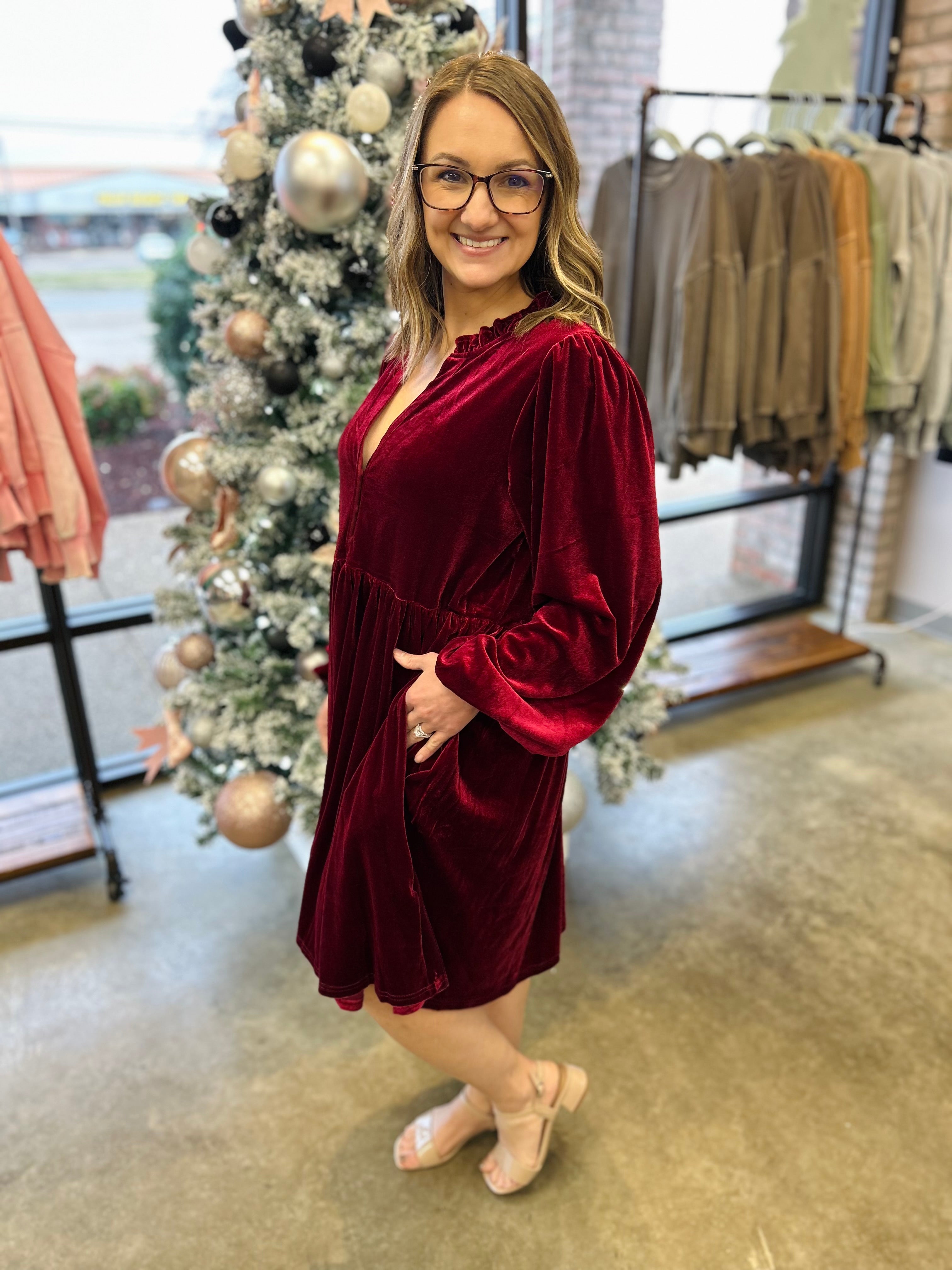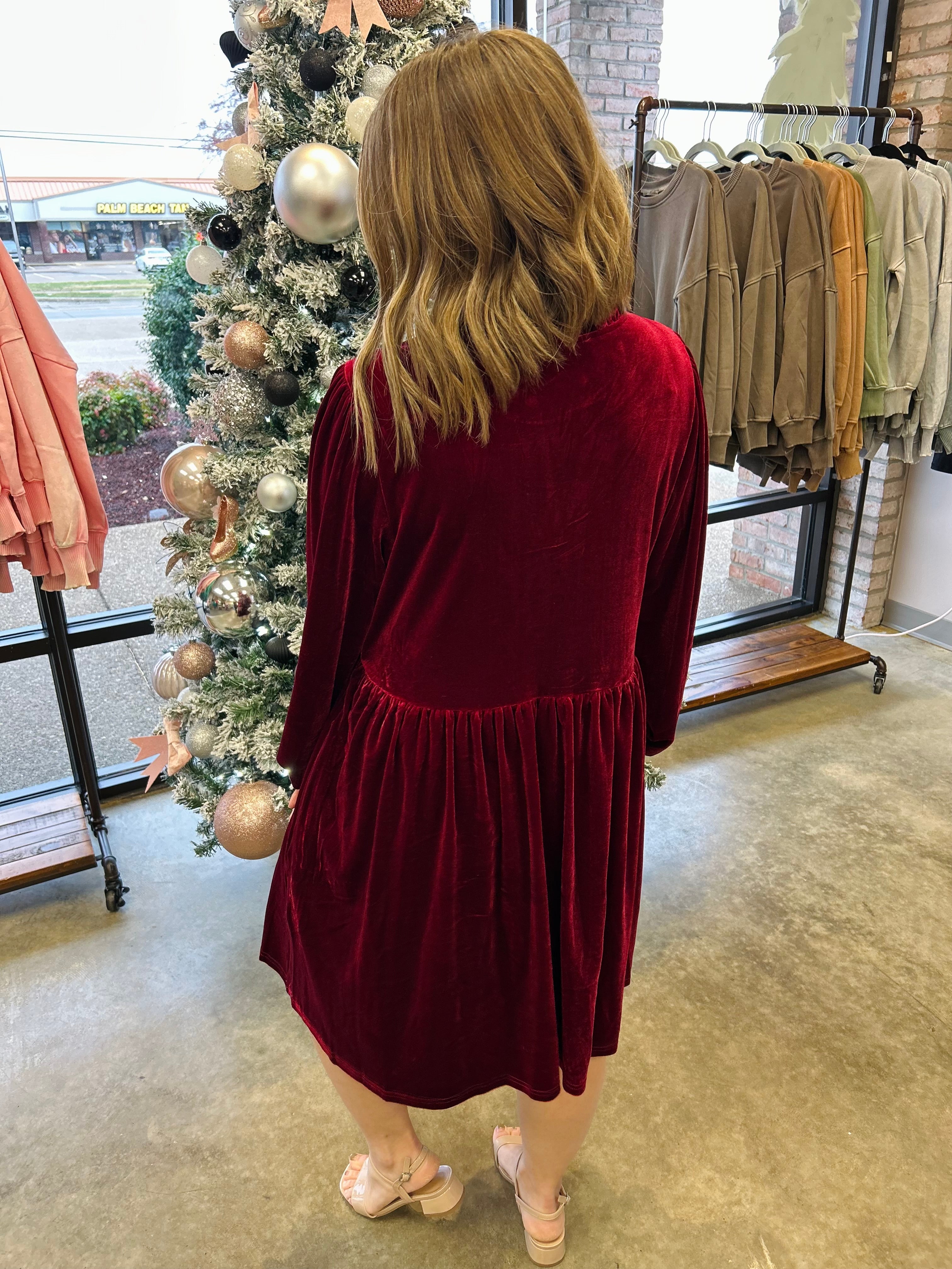 The Velvet Rose Babydoll Dress exudes romantic charm with a touch of luxe elegance. Crafted from rich burgundy velvet, this dress features a flattering babydoll silhouette that flows gracefully for a soft, feminine look. Its lightweight stretch ensures comfort while the plush fabric adds depth and sophistication. Perfect for date nights, special occasions, or holiday celebrations, the Velvet Rose Babydoll Dress pairs beautifully with heels or boots, making it an effortlessly chic choice for any occasion.