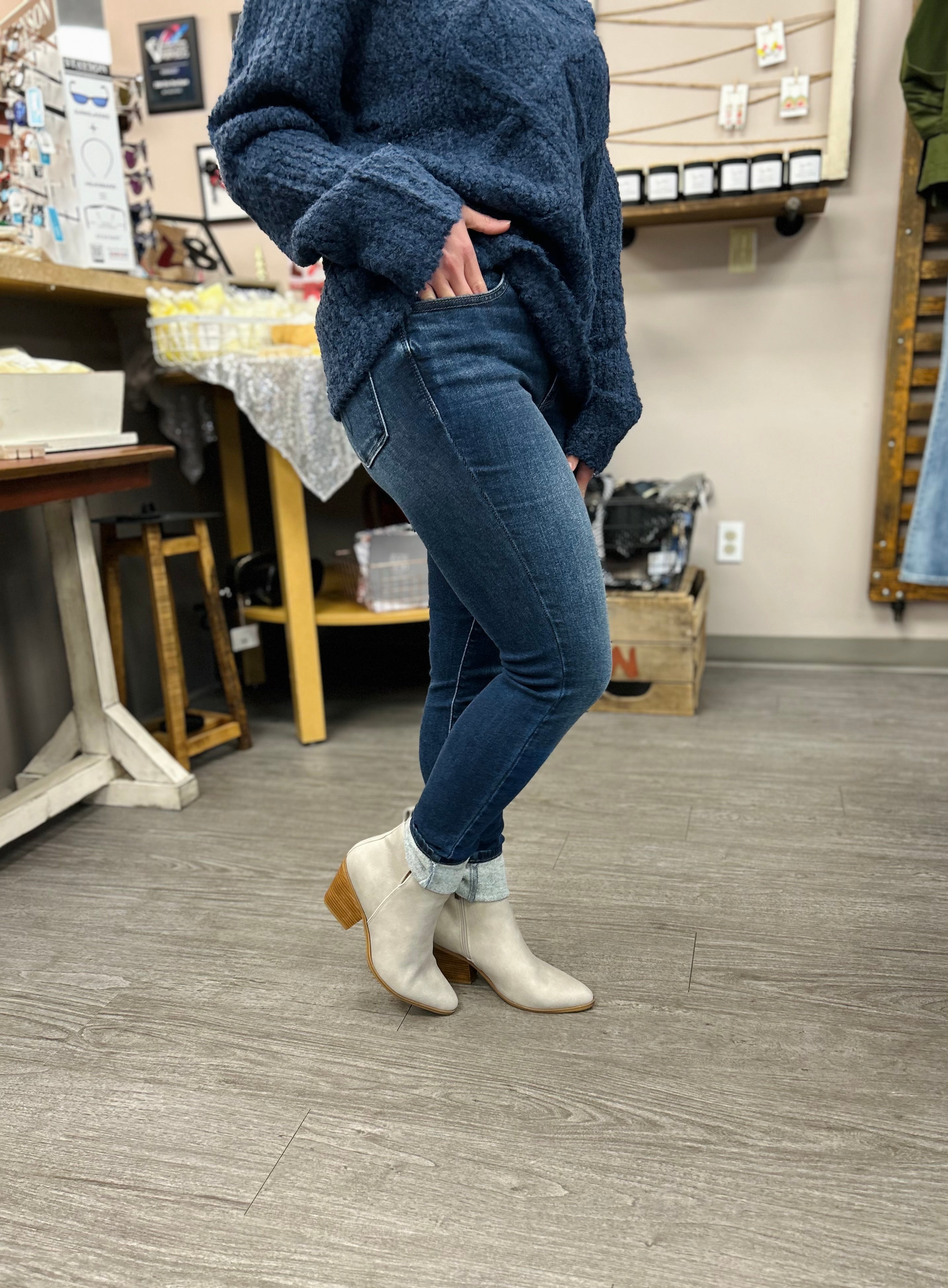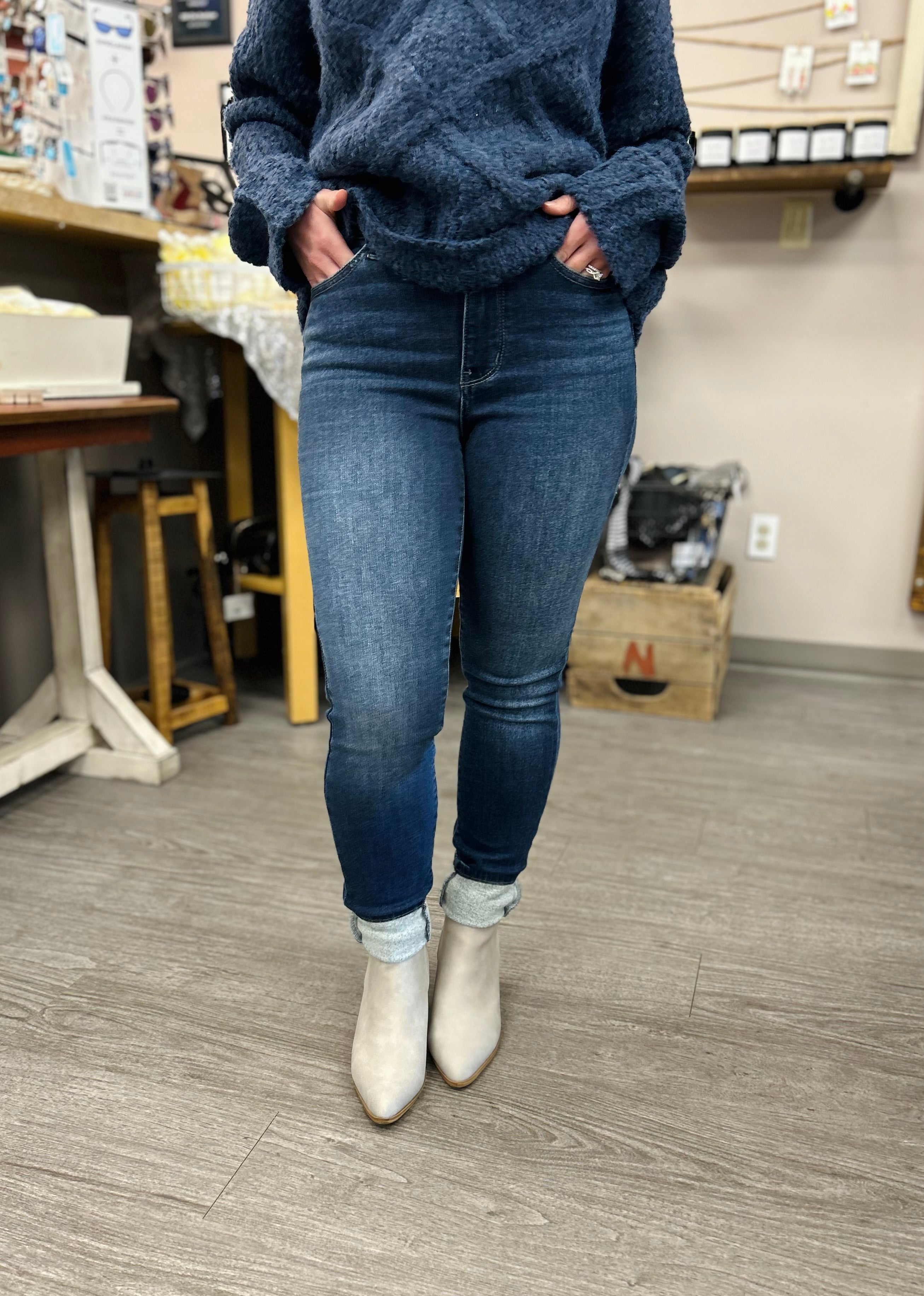 Our Judy Blue Mid Rise Dark Wash Thermal Skinny's have a nice thermal lining to keep you warm this season!