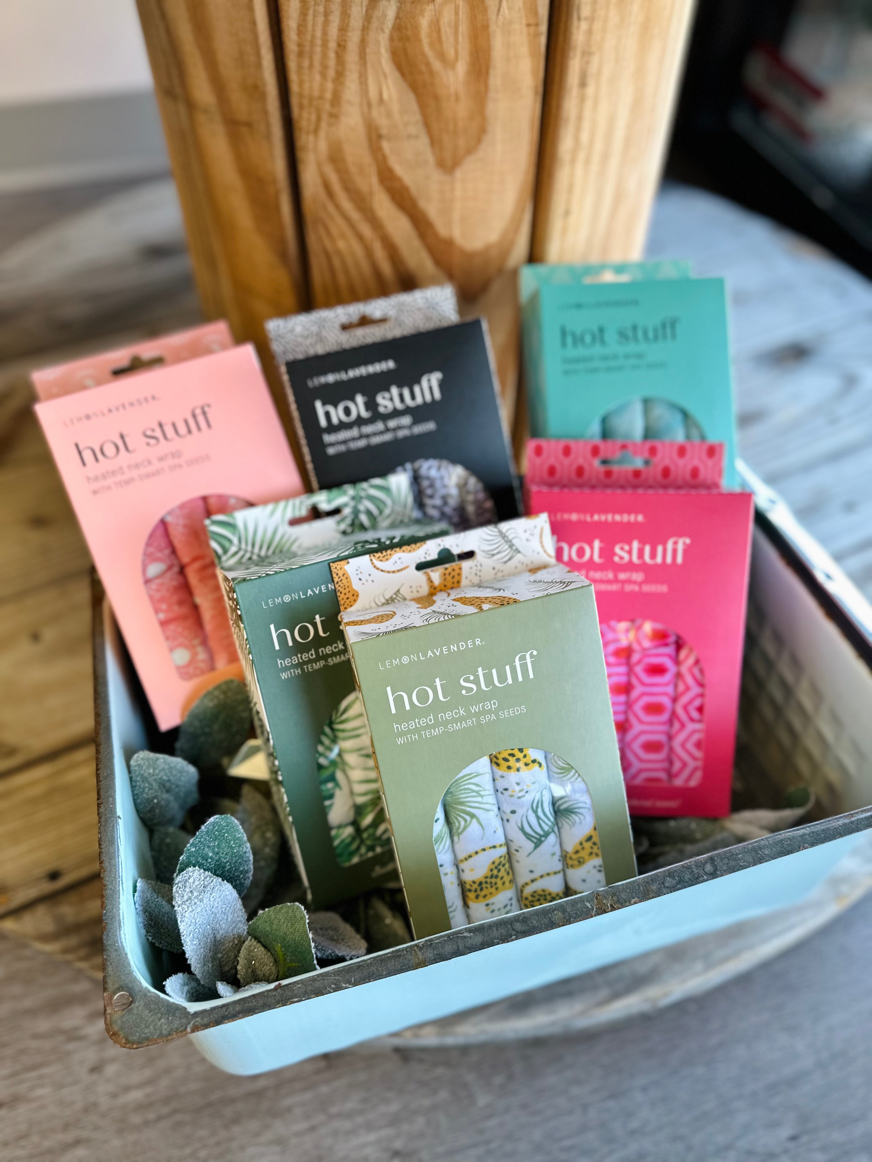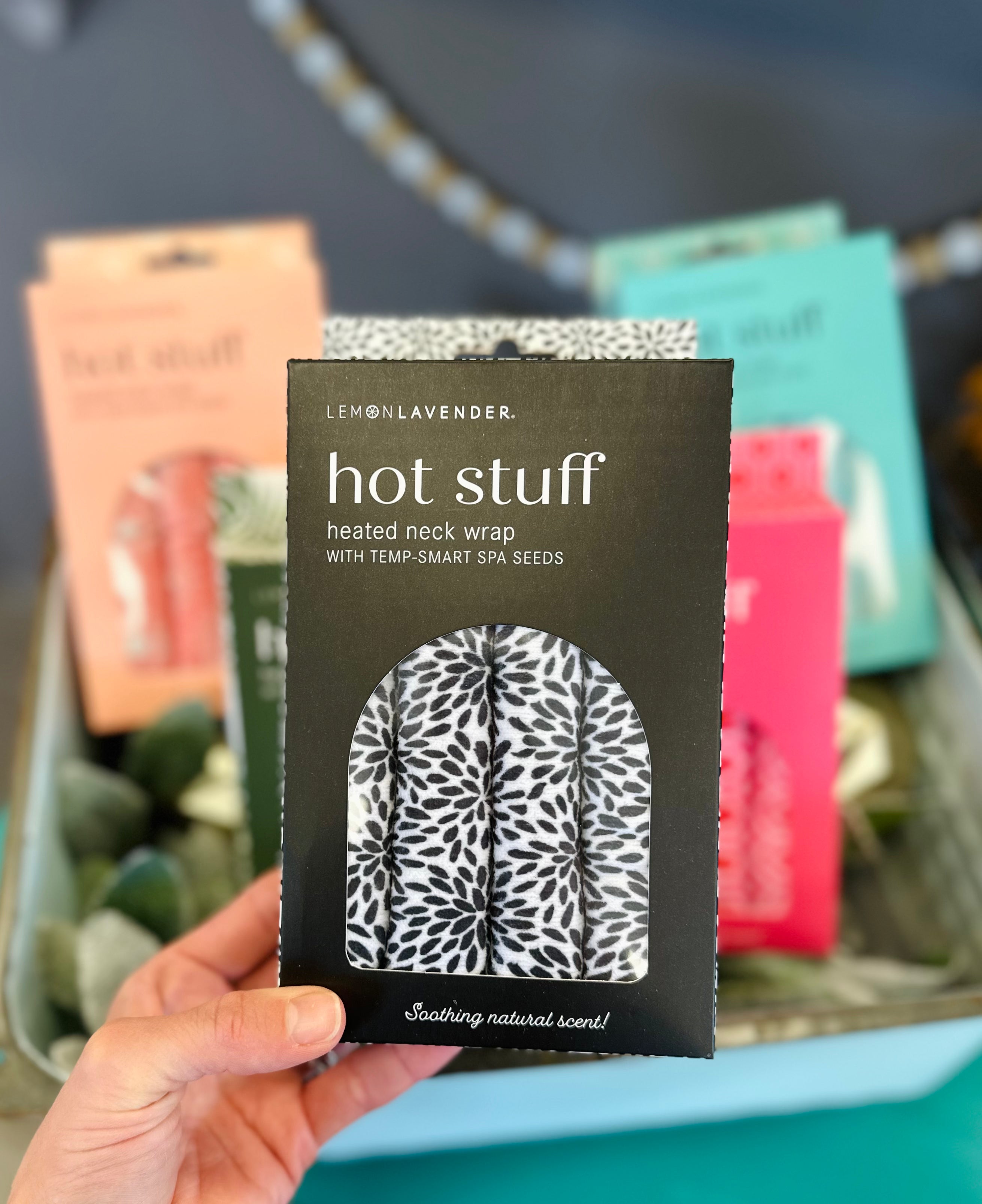 Lemon Lavender, Hot Stuff Heated Neck Wrap. Get that warm, fuzzy feeling with a neck wrap that hugs all the right spots. Filled with temp-smart spa seeds, this weighted microfiber wrap radiates warmth. Two handy handles keep your wrap in place to ease tension and de-stress from the day. Microwave for gentle heat therapy, filled with temp-smart spa seeds -Velvety microfiber -Handy double handles to keep in place.