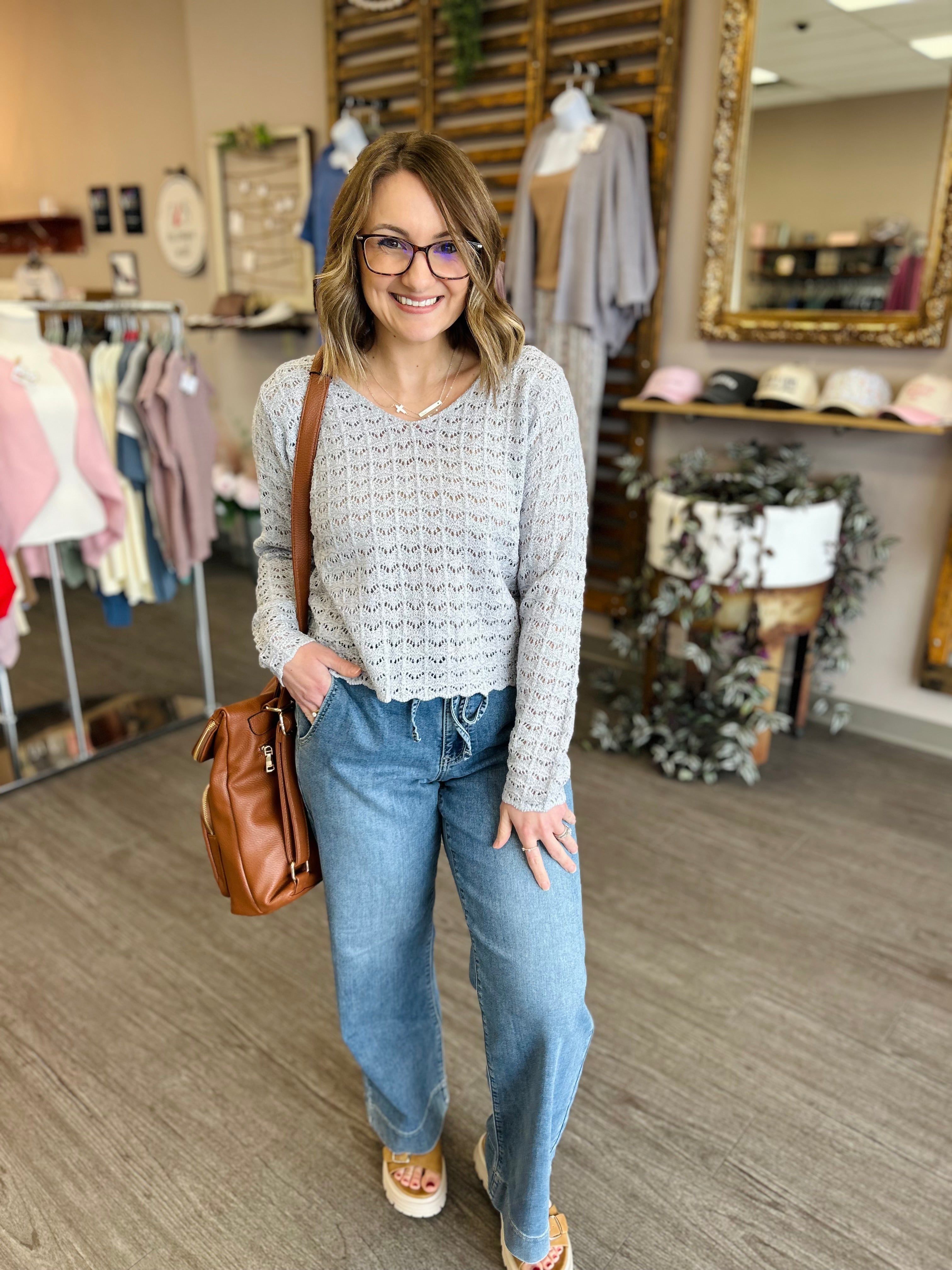 Bright, playful, and effortlessly feminine, the Scalloped Pointelle Top in Powder Blue adds a pop of color to any wardrobe. Crafted with delicate pointelle knit detailing, this top features a flattering V-neckline and a charming scalloped hem that adds subtle texture and visual interest. Soft and lightweight, it drapes beautifully for a comfortable, relaxed fit while still feeling polished. Perfect for pairing with jeans, skirts, or tailored trousers, this sweater brings a lively, confident touch to everyday looks.