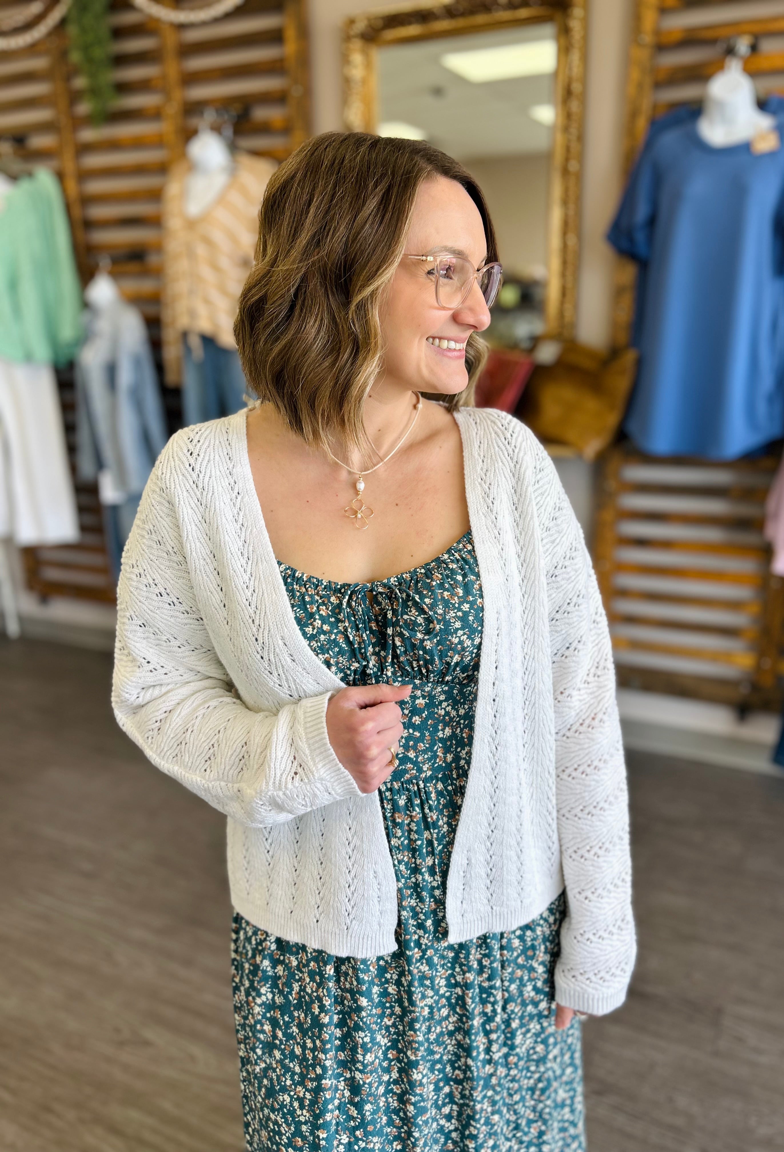 Light, airy, and effortlessly cozy, the Breezy Days Cardigan is the perfect layering piece for any season. Designed with an open crochet knit, it offers a breathable feel while adding soft texture and charm to your look. The relaxed fit makes it easy to throw on over tanks, dresses, or tees for an instantly polished outfit. Whether you're enjoying a cool morning or winding down in the evening, this cardigan brings just the right touch of comfort and laid-back style to your everyday wardrobe.