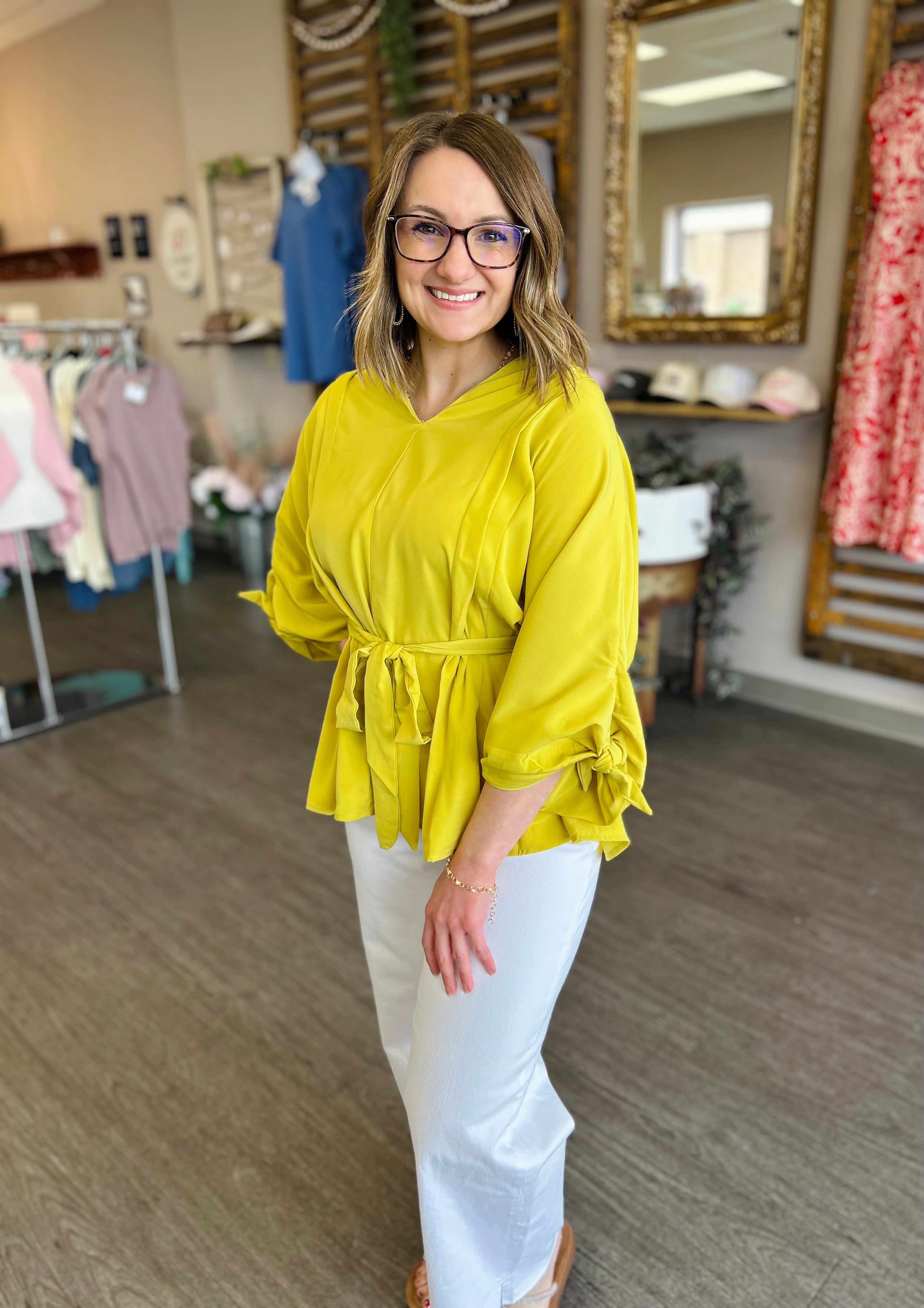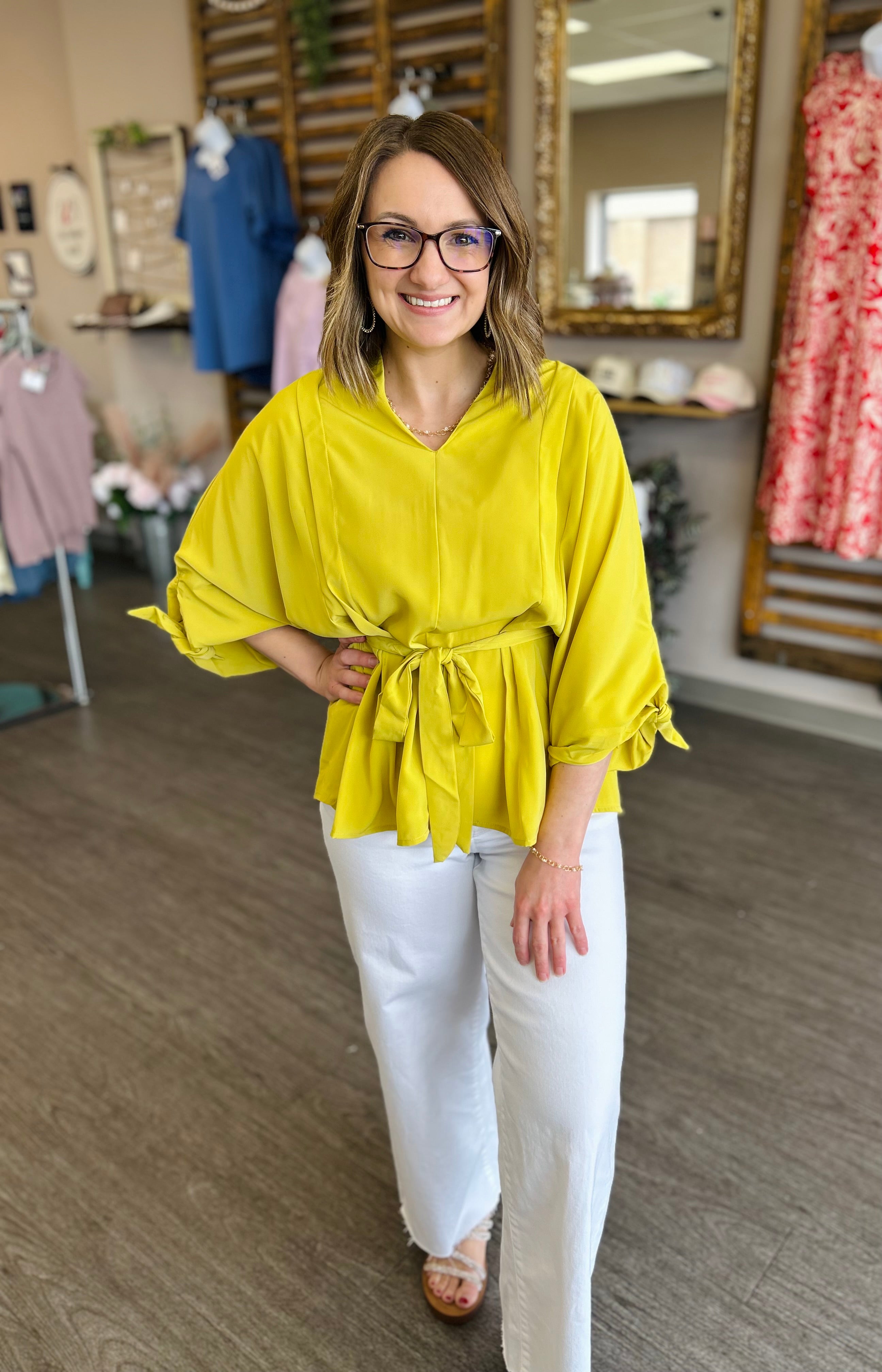 The Chartreuse Charm Top is a playful yet polished addition to your wardrobe. Crafted in a vibrant chartreuse hue, this 3/4 sleeve blouse features elegant tie cuffs and a flattering tie waist that cinches softly for a tailored, feminine silhouette. The relaxed yet refined fit makes it easy to pair with tailored pants, skirts, or denim, while the bright color brings a fresh, uplifting touch to any outfit. Perfect for workdays, weekend outings, or layered looks, this top balances effortless style with a cheerful pop of color.