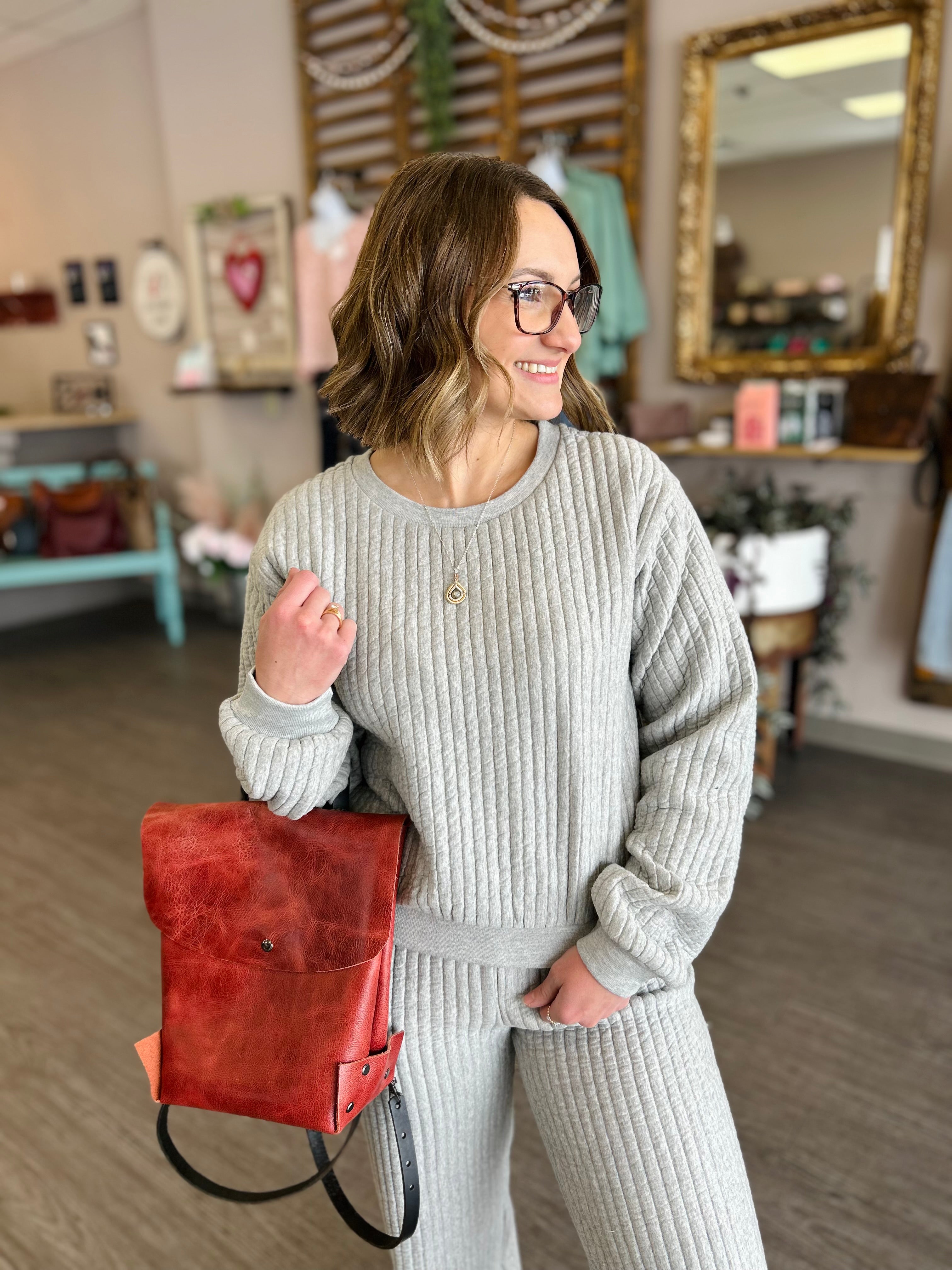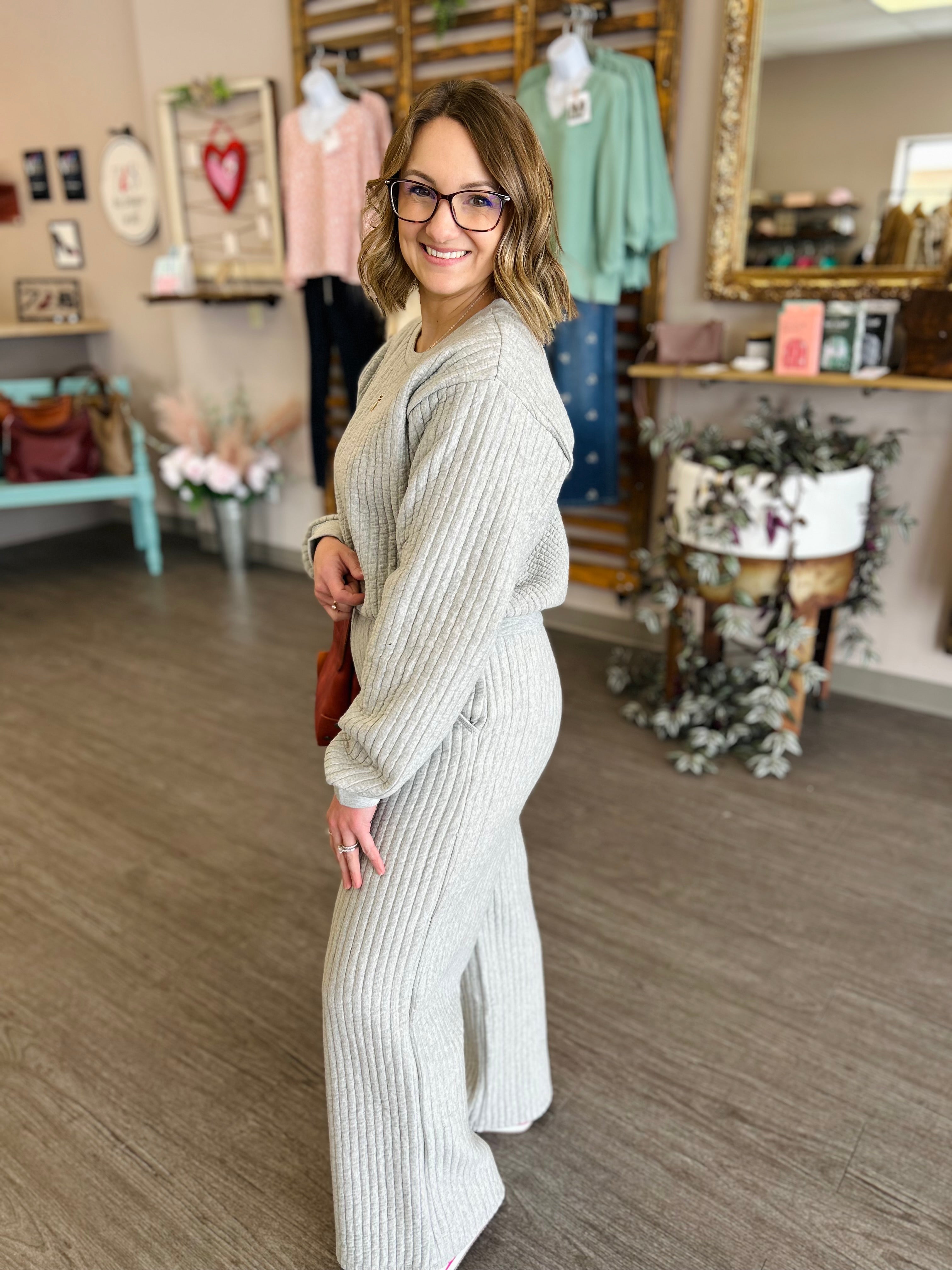 The Grey Horizon Quilted Set is the ultimate blend of comfort and elevated style. Crafted from soft quilted fabric, this matching set features a relaxed yet perfect look for everyday wear or cozy lounging. The versatile grey hue offers a polished, modern look, while the structured quilting adds subtle texture and dimension. Ideal for mixing and matching or wearing together for a streamlined, put-together outfit, this set delivers effortless style with all-day comfort. Stretch band hemline at bottom of top and top of pants!