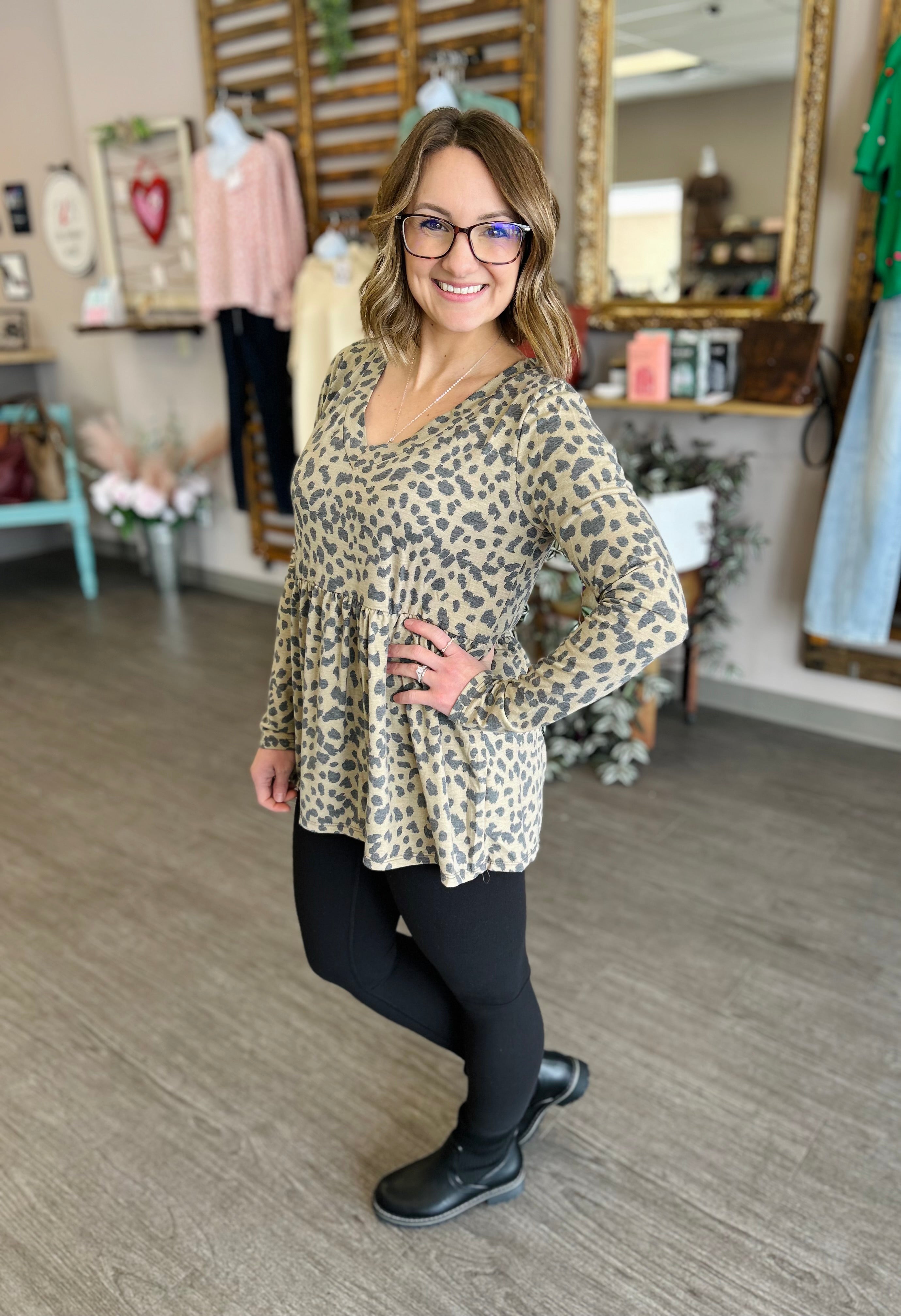 The Wild Grace Babydoll Top combines bold style with effortless femininity. Featuring a classic leopard print and long sleeves, this top is designed with a flattering babydoll silhouette that flows beautifully for an easy, comfortable fit. The lightweight fabric makes it perfect for layering or wearing on its own, while the playful shape adds movement and charm. Pair it with denim, leggings, or boots for a look that’s equal parts relaxed, stylish, and confidently chic.