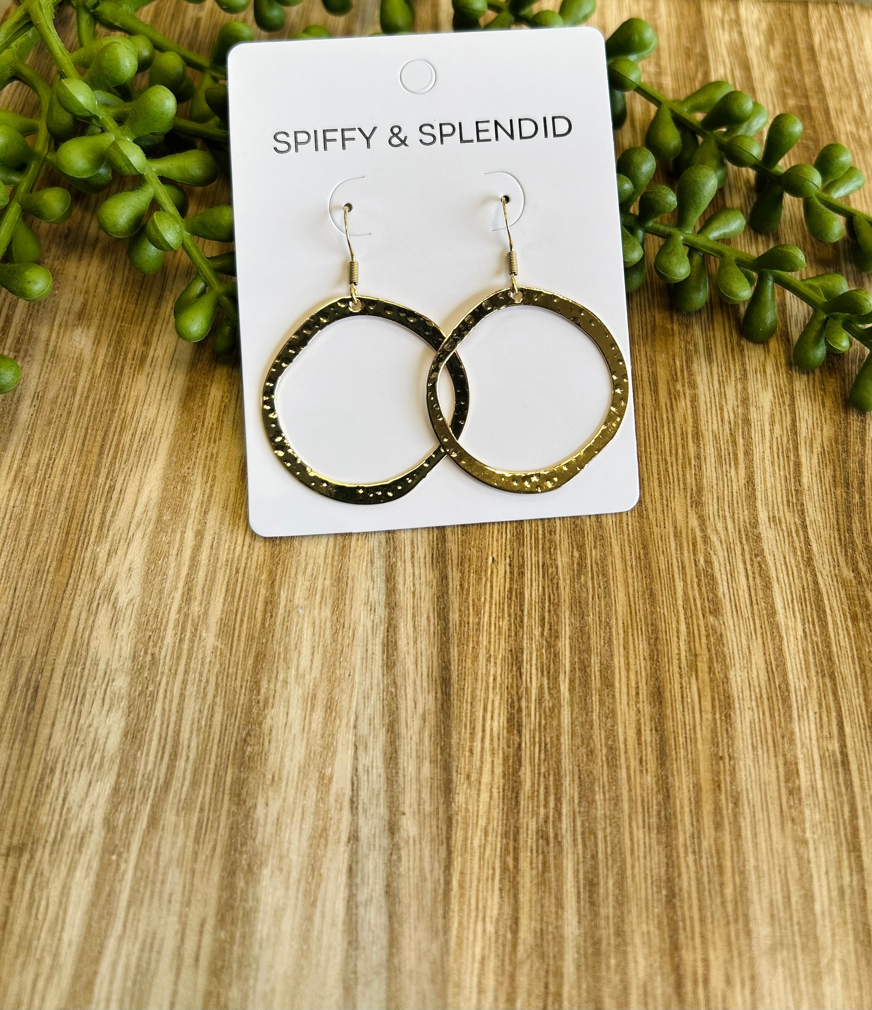 A Modern Twist on a Classic Circle Meet the Lainey Earrings, a modern and elegant take on a classic shape. These statement earrings feature an abstract cutout circle design with a unique hammered brass texture that catches the light beautifully. Finished with a rich gold plating, they offer a sophisticated glow that's both modern and timeless.