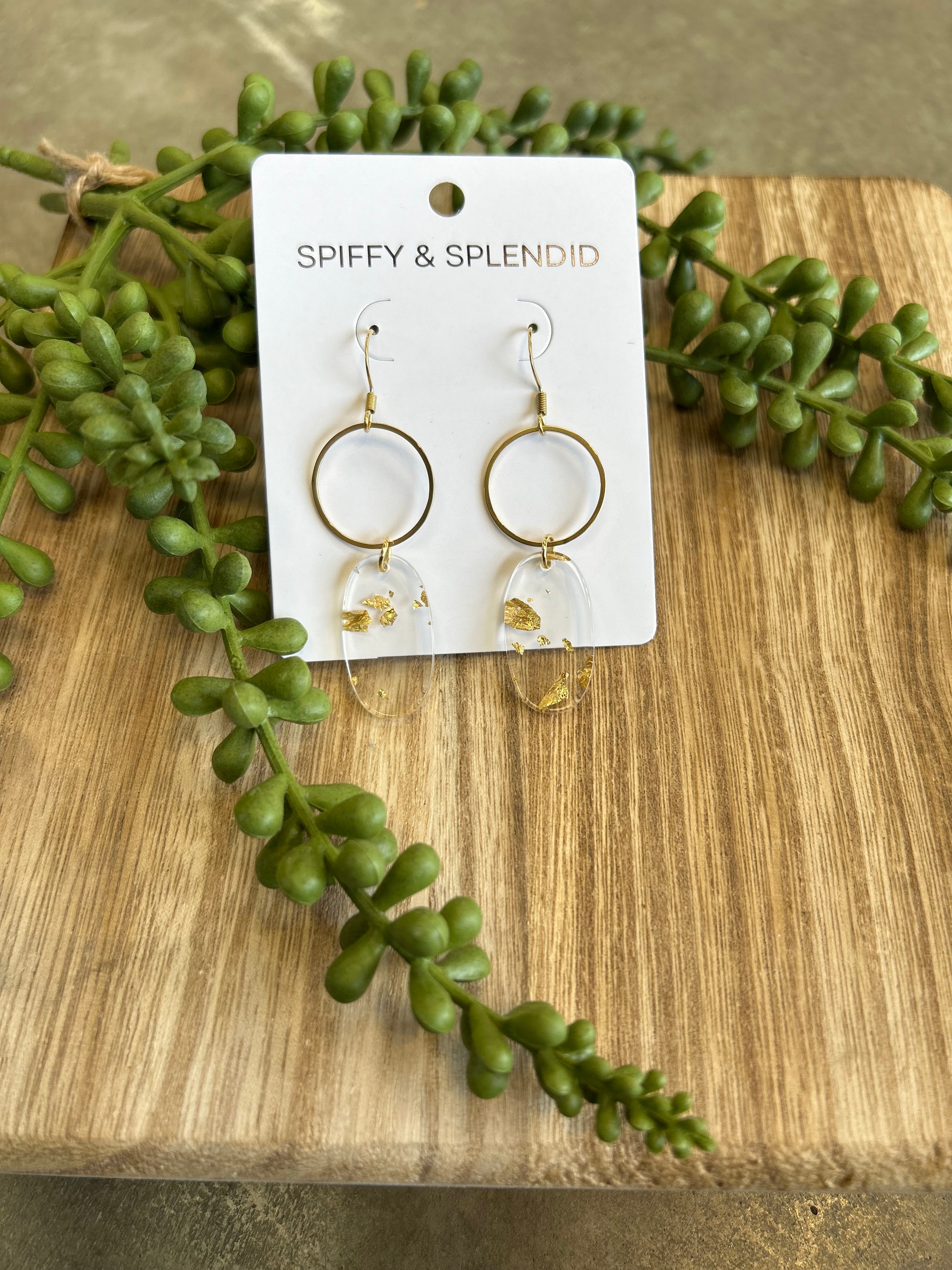 Accentuate any outfit with the stunning Rene Earrings. These dainty earrings feature clear acrylic charms in sparkling gold foil. Perfect for elevating your everyday look.