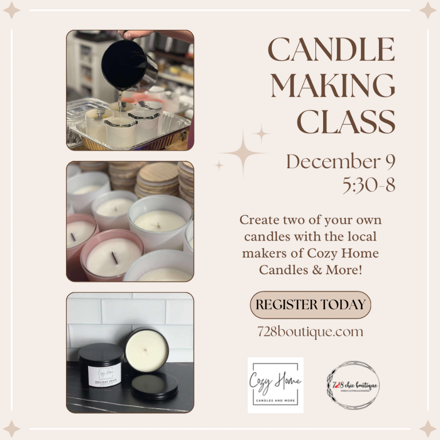 Join us for a fun and creative experience as you design and pour your own custom candles! In this hands-on workshop, you’ll create two 6 oz candles using premium soy wax and beautiful fragrance oils! Cozy Home Candle Co will guide you step-by-step—from choosing your scents to pouring your candles. Due to the process of candle making and the candles setting, your candles will be ready for pick up the next day in the afternoon!