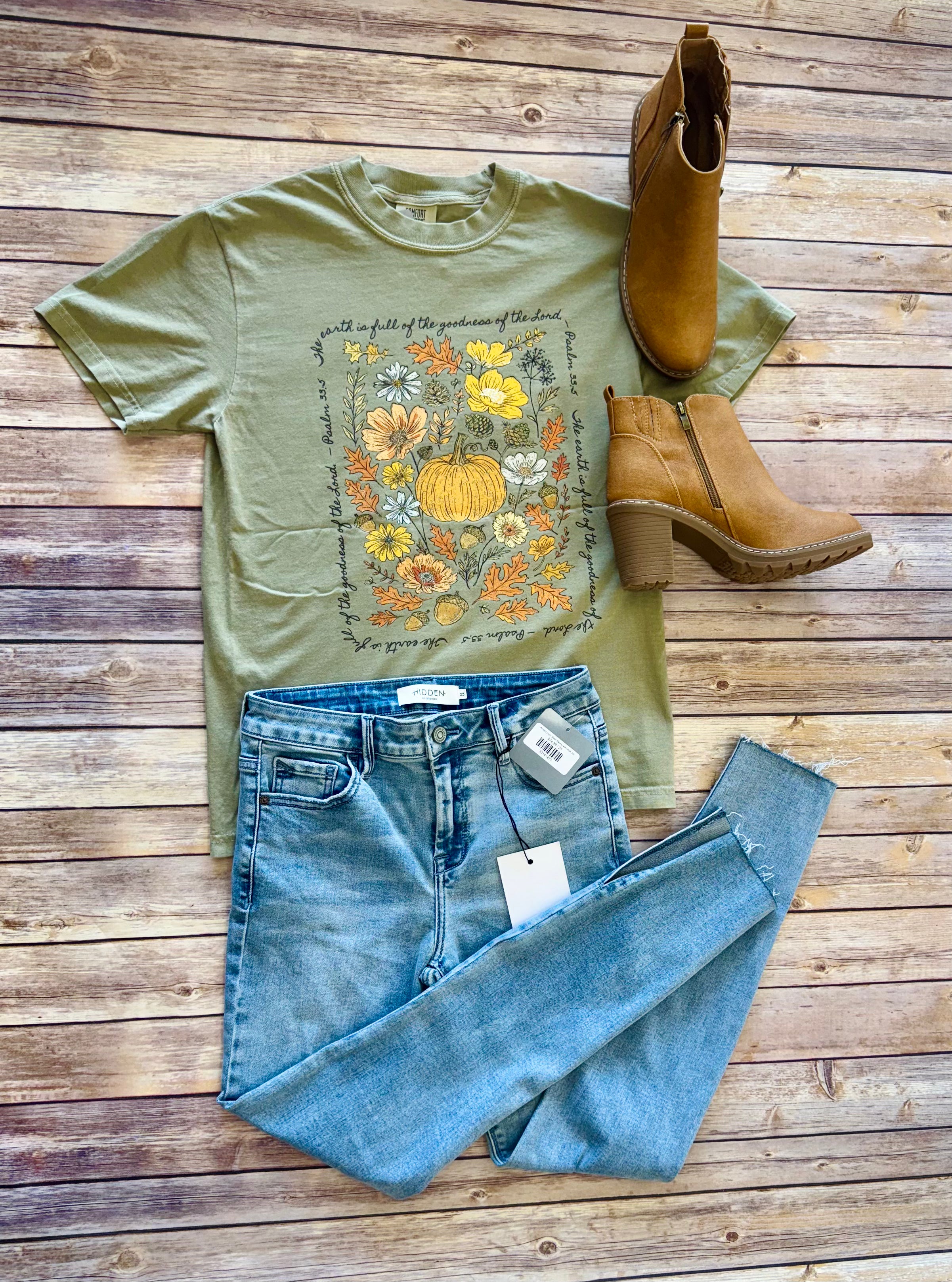 Goodness of the Lord Tee- Psalm 33:5. Share your faith in comfort and style with this inspirational graphic tee. Featuring the uplifting words "The earth is full of the goodness of the Lord: from Psalm 33:5, this shirt is a daily reminder of God's promises. Crafted in soft, breathable fabric with a relaxed fit, it's perfect for pairing with jeans, layering under shackets, or styling for casual days at church, school or home. A meaningful and versatile piece, this tee makes a thoughtful gift for women who want to wear their faith proudly.