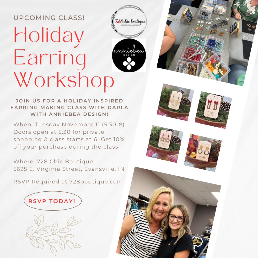 Join us for a holiday earring making class with Darla with Anniebea Design! Invite your bestie or your mom and make it a girls night out!