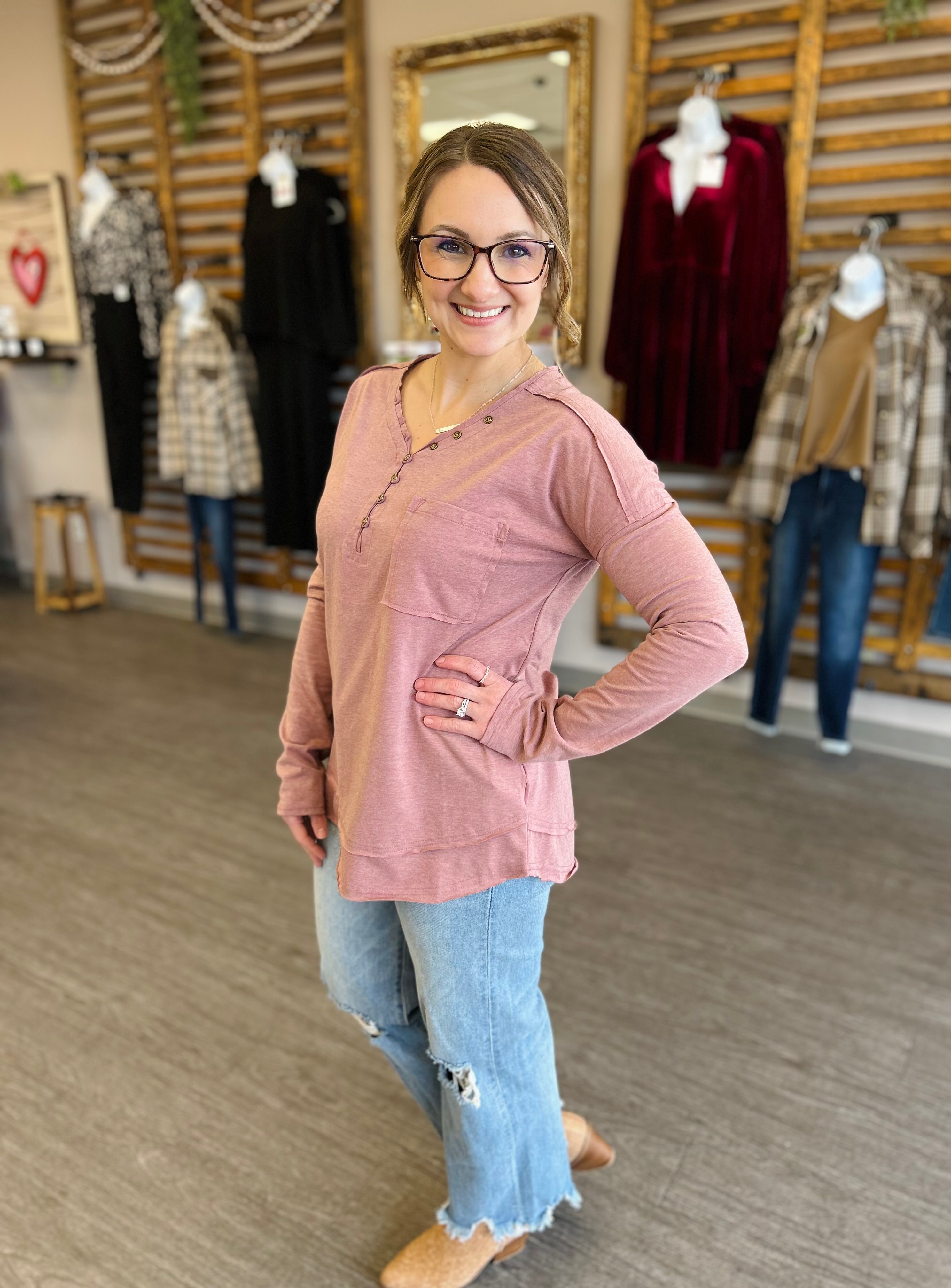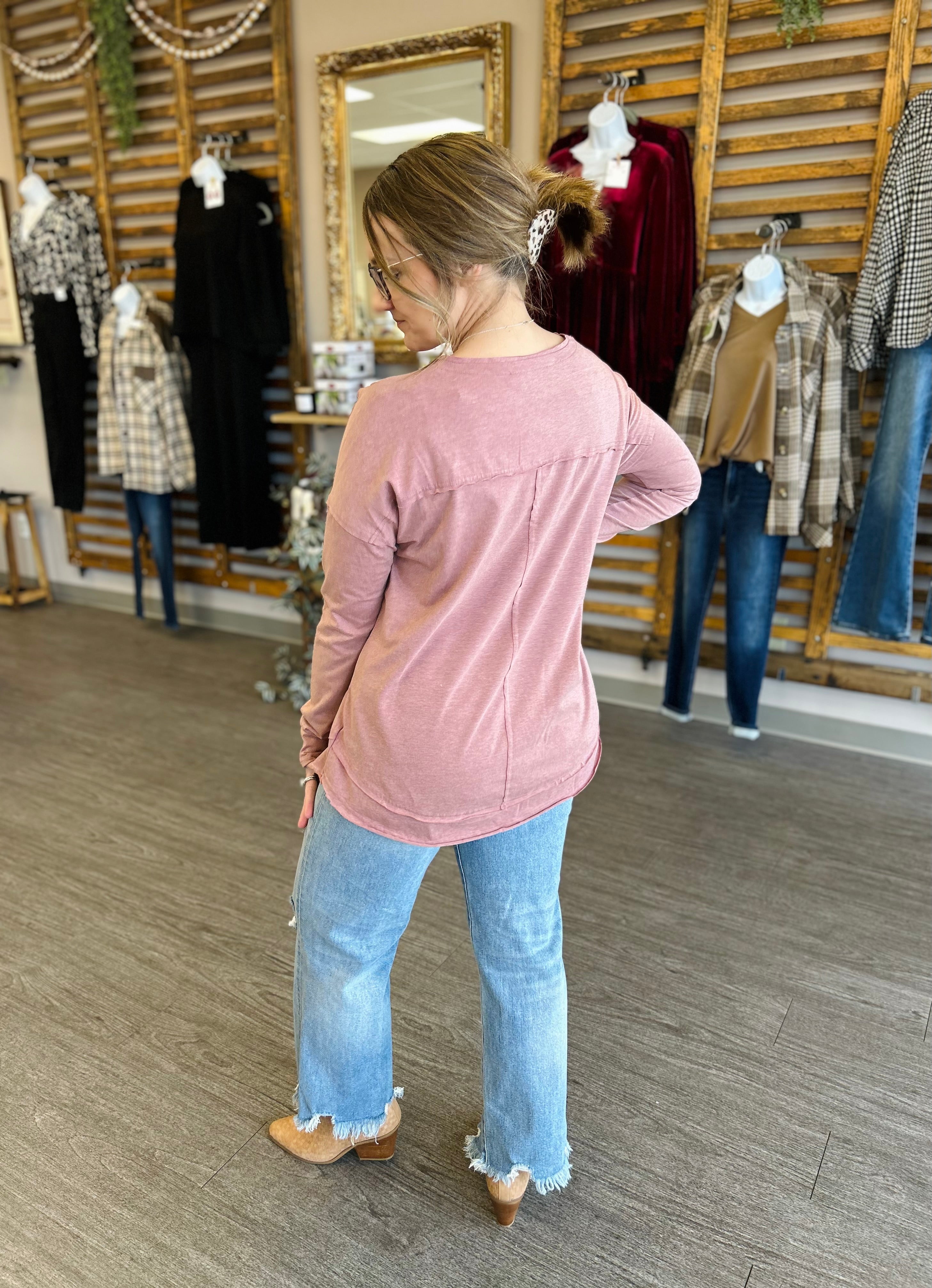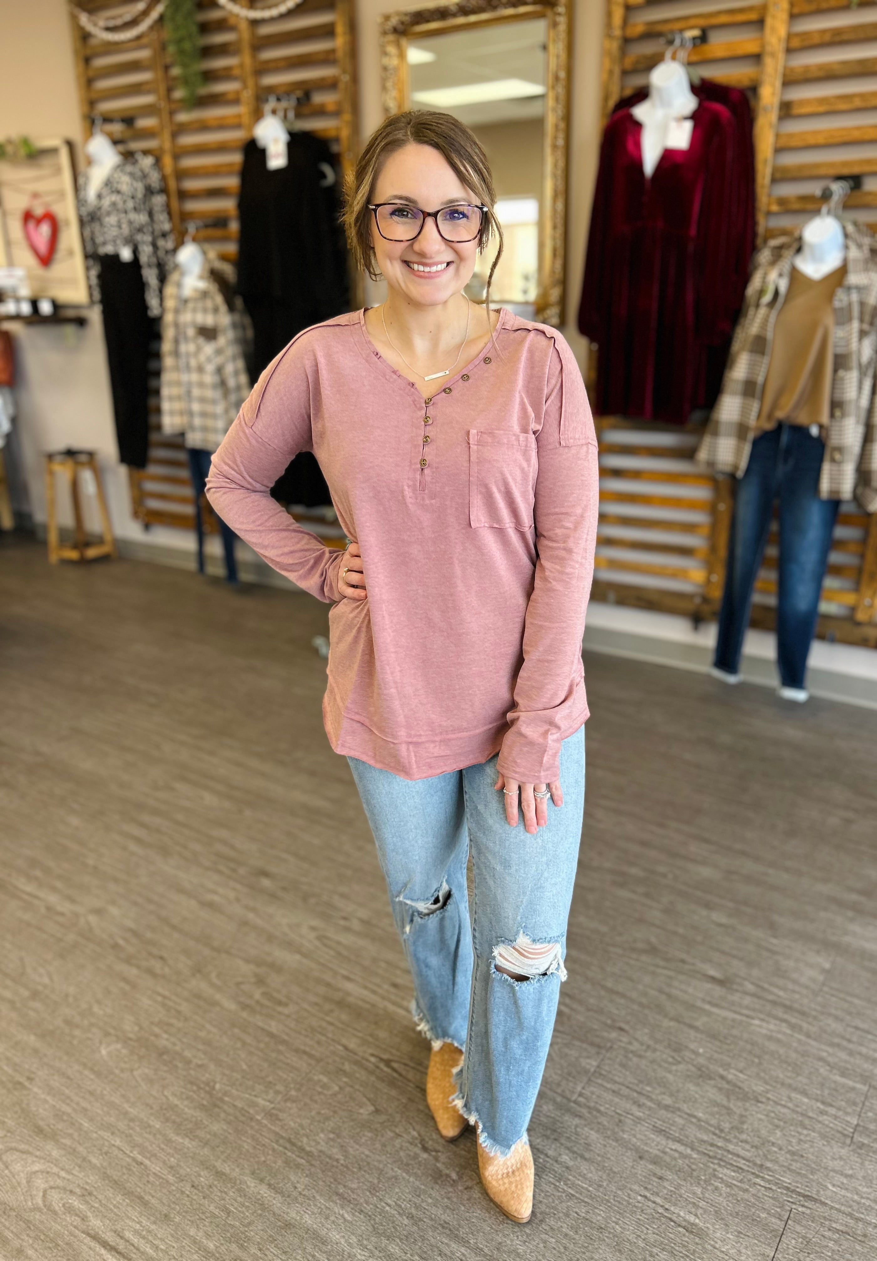 Laid-back comfort meets effortless style in the Weekend Ease Mauve Mineral Wash Top. Designed with a soft, lived-in mineral wash, this comfy top features a relaxed fit and a button neck detail that adds just the right touch of casual charm. The lightweight, breathable fabric makes it perfect for all-day wear, whether you’re lounging at home or heading out for weekend errands. Easy to style with denim or leggings, this top is your go-to piece for relaxed days and cozy moments.